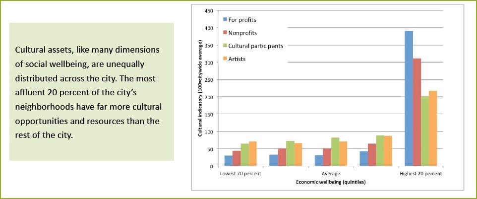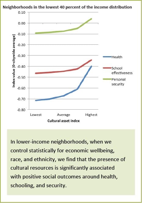 However, one of the report’s most surprising findings is that the cultural sector is phenomenally informal. In the discovery phase of the study, SIAP found more than 4,700 cultural providers in the nonprofit sector and more that 17,000 for-profit cultural entities. Not only is much of this cultural work “off the books,” but the presence of these organizations in lower-income districts has a measurable, beneficial effect on residents’ social wellbeing — including health, school effectiveness, and personal security. In fact, the study found that cultural organizations’ strongest impact on social wellbeing is not in areas with the largest number of resources, but rather in lower-income districts where the social connections they facilitate operate as a form of capital, substituting for the financial capital available in other places. As SIAP writes: “culture makes a difference in these communities by enhancing social connection, amplifying community voice, and animating the public environment.”