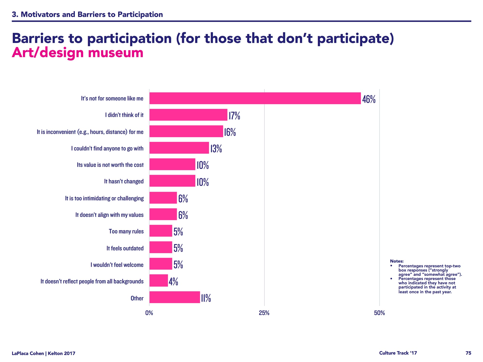 For art museums specifically, when asked why people go to them, the three top answers were “learning something new,” “experiencing new things,” and “interest in the content.” The fourth most common answer, “having fun,” topped the charts for a majority of the other categories, including dance and opera. When asked what was considered to be a “barrier to participation,” most people who like to attend cultural activities cited inconvenience, whereas those who don’t generally attend such events said “it’s not for someone like me” — an answer particularly prevalent in the art museum category.