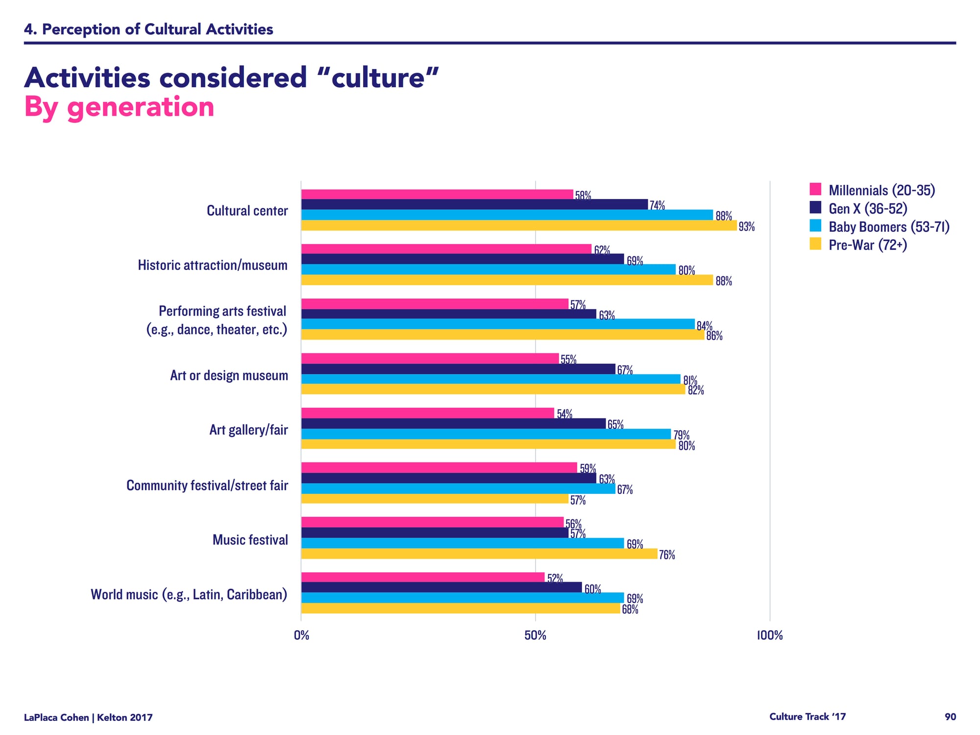 In terms of how people define “culture,” it seems it’s no longer limited to museums, theater, and music. Culture Track found that 62% of respondents think of street festivals as a cultural activity, while less than 50% answered the same of opera and ballet. Culture Track calls this new melding of “low” and “high” culture a “paradigm shift” in how we think of culture at large. When these results are broken down by generation, it becomes clear that young people are leading the way in this expanded view of culture.