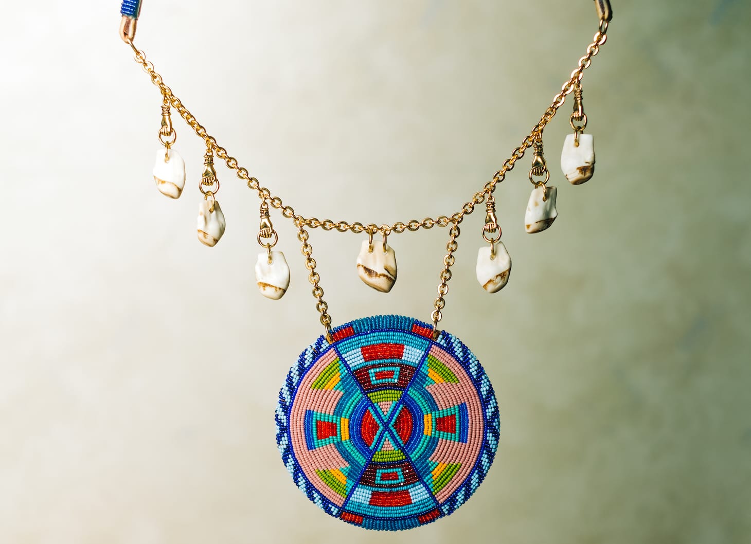 Elias Not Afraid (Crow): Whether using Crow designs as inspiration or digging into his creative processes, Elias’s beadwork is inspiring, fashionable, and vibrant. He often includes items that are important to his culture, like the elk teeth in this work.