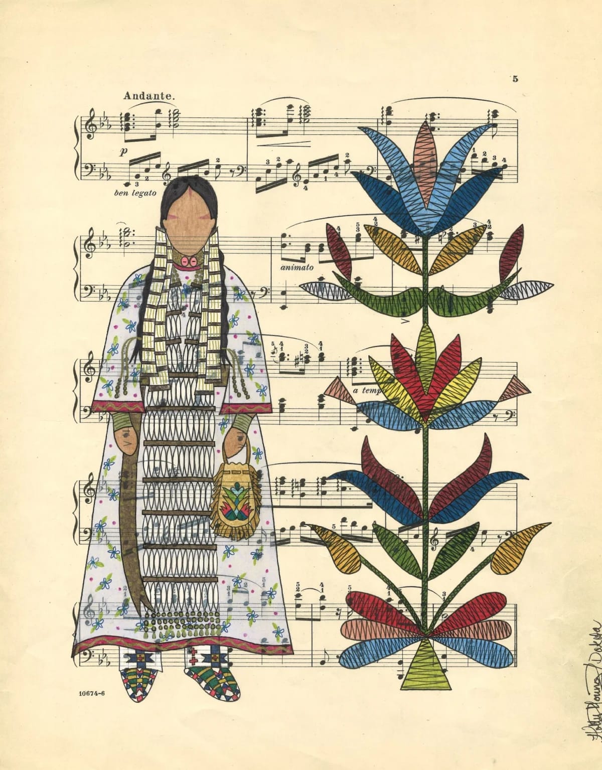 Holly Young (Standing Rock): There are a handful of women creating Plains-style graphic works, a media that was historically done by men. Holly’s work often focuses on her guiding light; her ancestors, and Dakota aesthetics. The musical notes on the paper compliment the graceful curvilinear lines of the floral motifs that are often found in her work.