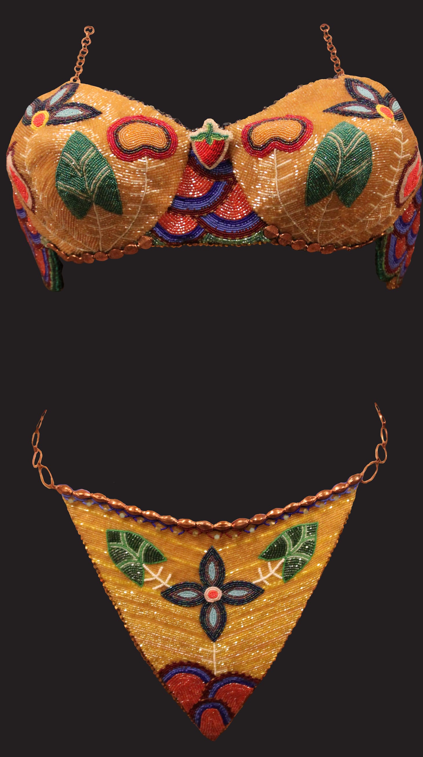 Summer F. Peters (Saginaw Chippewa): I enjoy Indian Market because it challenges how we often think about Native American art; it breaks boundaries that we have artificially imposed. Summer uses traditional Ojibwe artistic beadwork to create unexpected contemporary pieces. Here, Summer created a set that speaks to the past, present, and Native femininity.