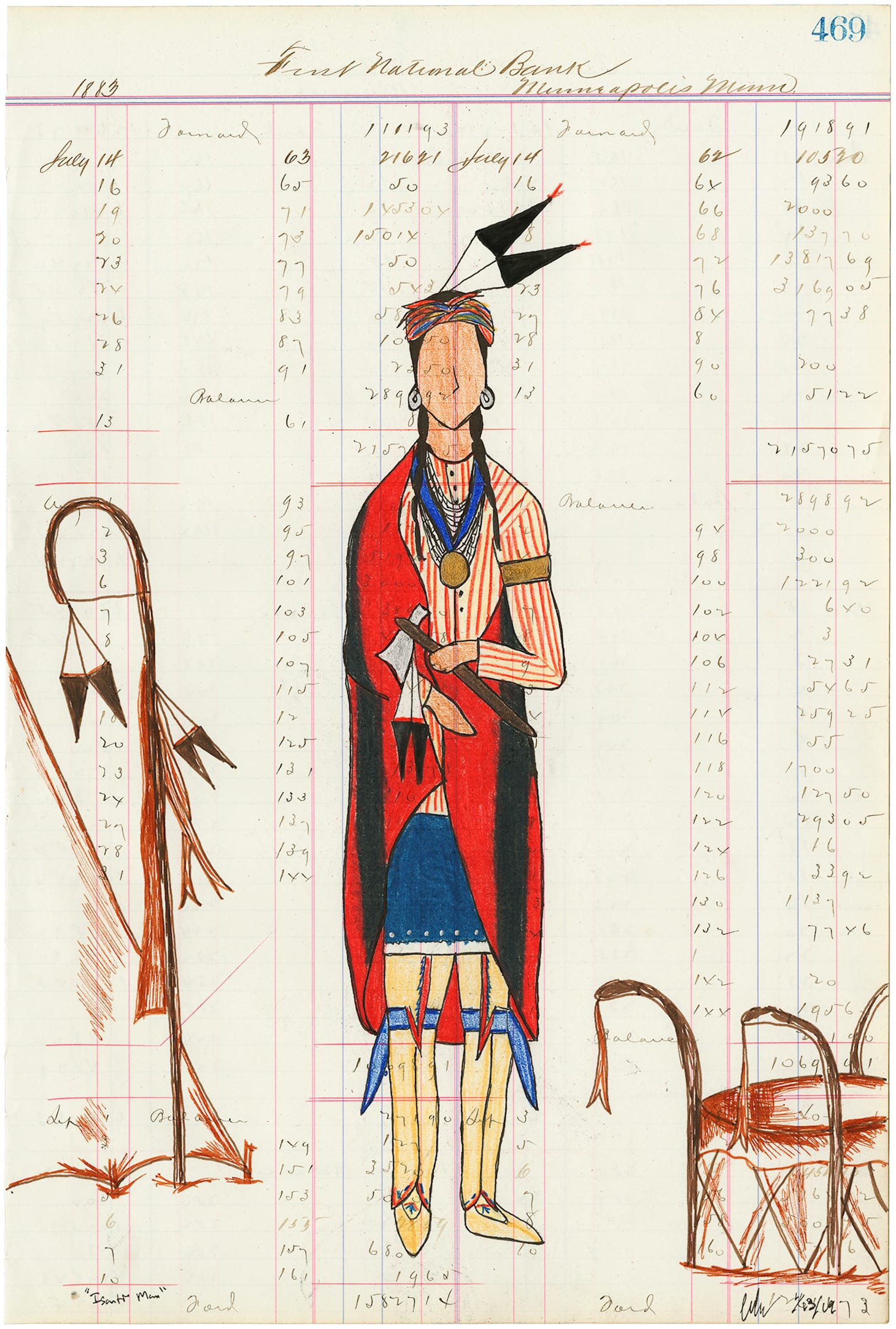 Cole Red Horse Jacobson, “Isanti Man” (2019), ledger drawing (image courtesy the artist)