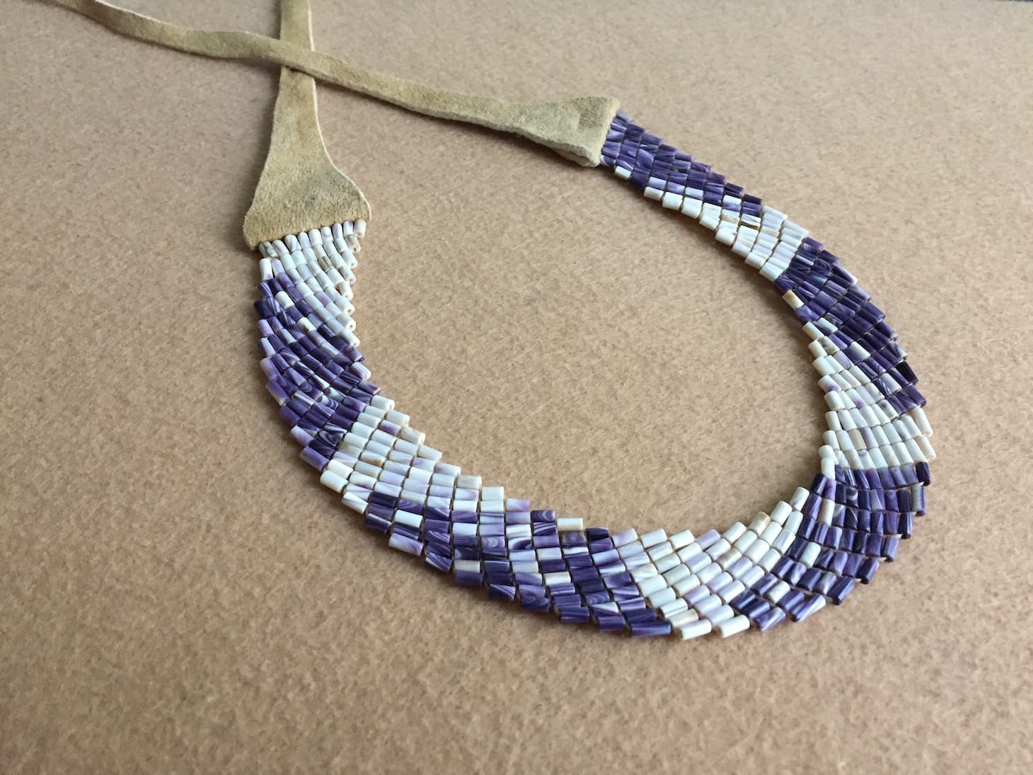 Elizabeth James-Perry, “Wampum Coastal Alliance Collar” (2019), wampum beads and smoked deerskin (image courtesy the artist)