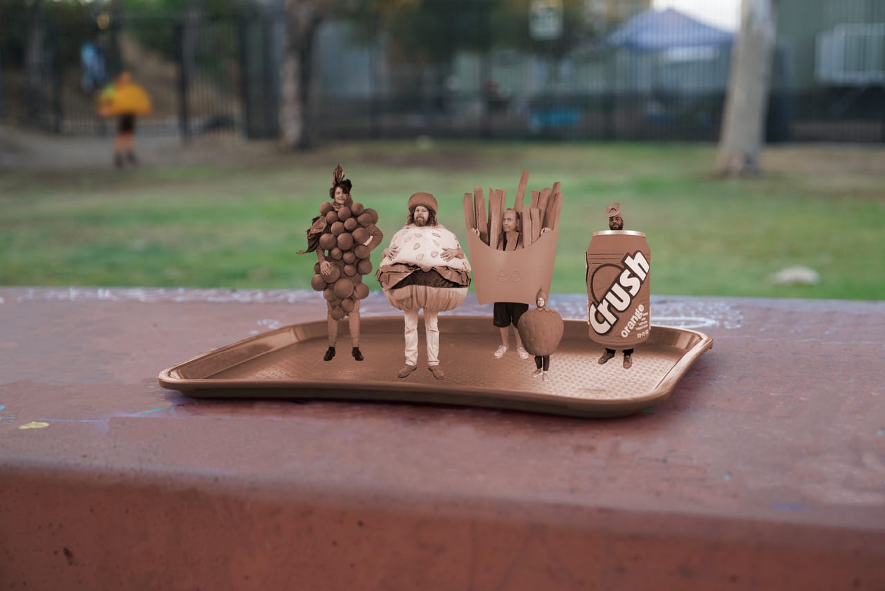 Jazmin Urrea will install eight-foot-tall monoliths of Flamin’ Hot Cheetos® in South LA’s Martin Luther King Jr. Park, turning popular junk food into a monument to food insecurity. Ry Rocklen will transform Palms Park into a giant digestive system with bronze sculptures based on his Food Group characters dressed as popcorn, tacos, pizza, hot dogs, and other hand-held foods. In Reseda Recreation Center, Eva Aguila’s Comida A Mano will also examine eating with our hands, featuring a Mexican comal over an earthen oven with demonstrations by a local tortillero artist, accompanied by experimental videos “honoring utensil-less cuisines around the world.”