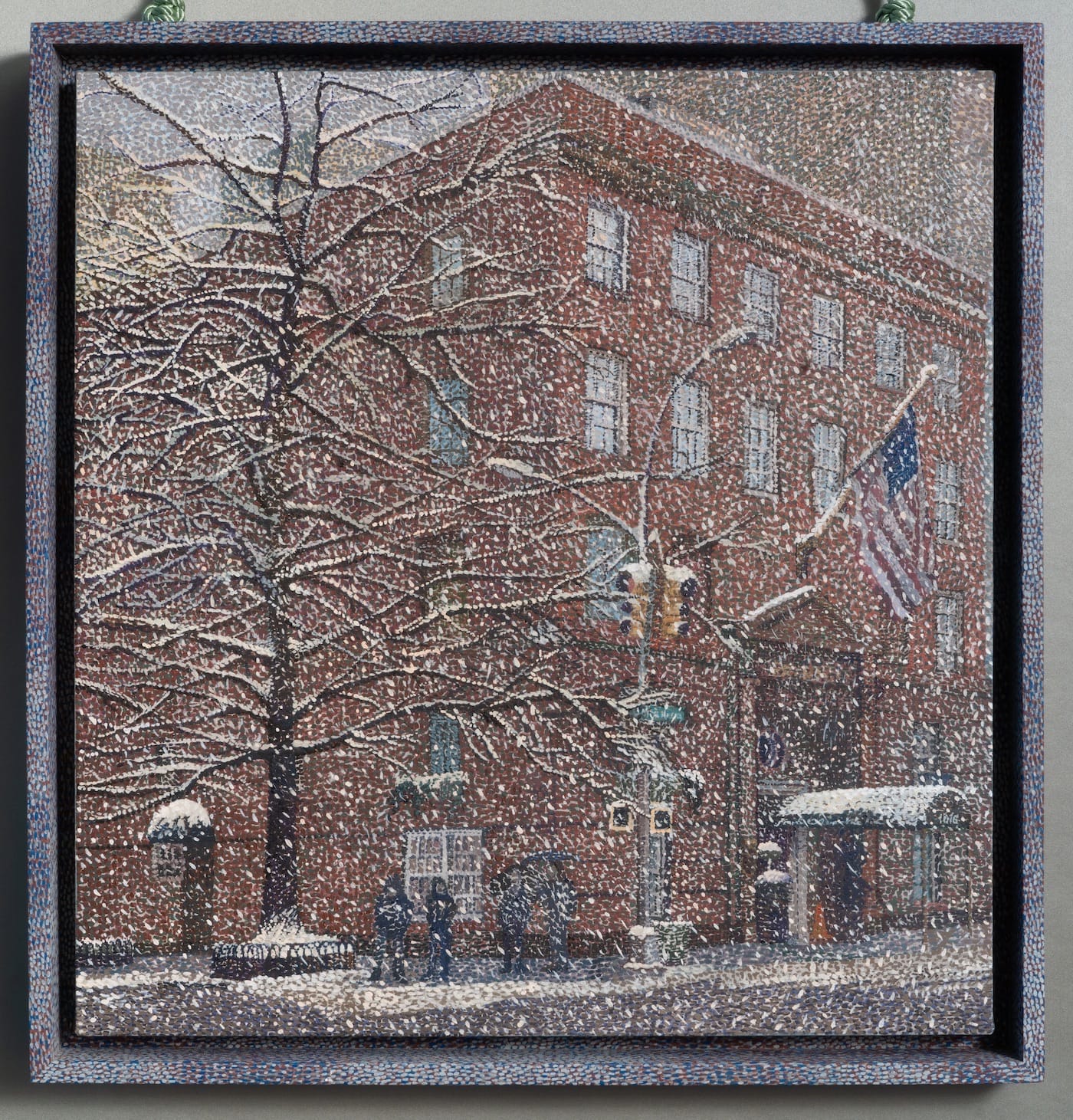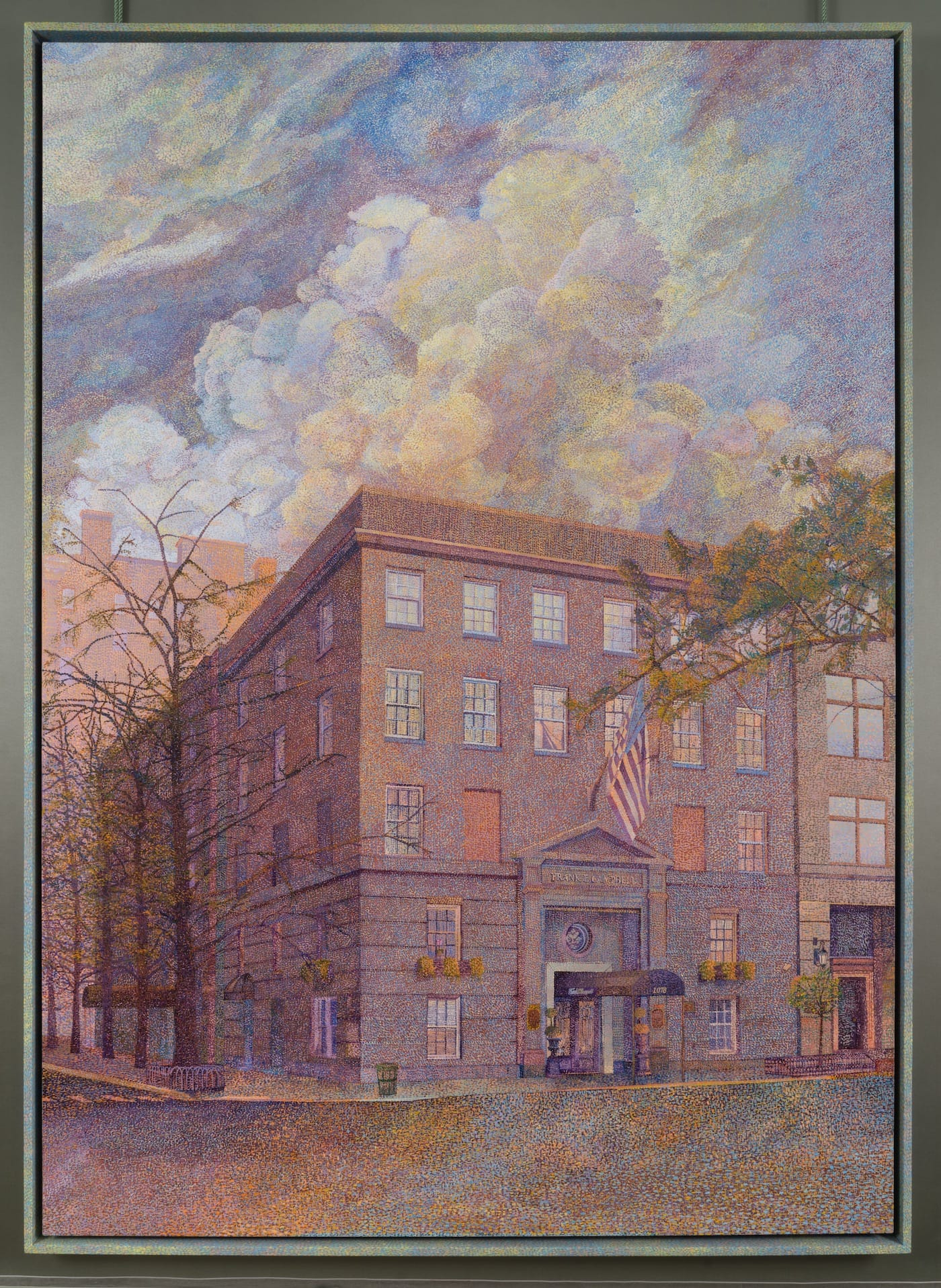 The press release for 1076 Madison describes Talmadge’s paintings as “a particular brand of rarified melancholy,” but that description is a bit overblown. Actually, she follows a long history of artists who have unpacked America’s relationship to despair through architecture. Grant Wood and Edward Hopper spring to mind, as does Maureen Gallace. Like those artists, Talmadge excels at inscribing loneliness into brick and mortar. A latent, ill-formed unease develops on the emotional edge of her seemingly benign pointillist paintings. Anxiety accrues when the visitor considers the paradoxical absence of spectacle in an artwork that consists of literally thousands upon thousands of tiny dots.