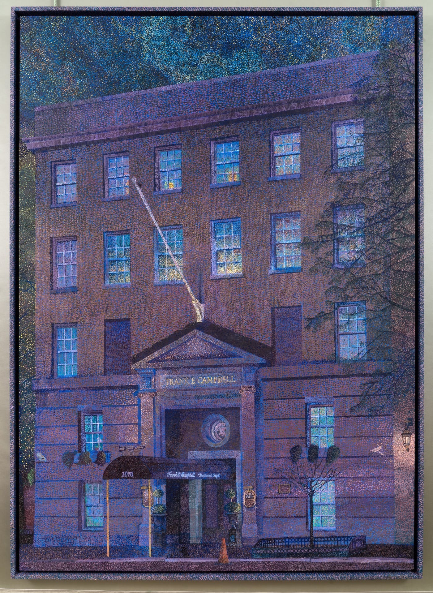 Perhaps there’s no difference at all. That’s certainly the unspoken message of Talmadge’s exhibition, for which she appropriates pointillism as the perfect aesthetic form to envisage a funeral home. There’s something intentionally plodding about the eight paintings on display. Like Claude Monet’s series of Rouen Cathedral paintings, Talmadge observes the changing atmospheric conditions of time, light, and weather on the façade of Frank E. Campbell. The result is deceptively laconic, an accumulation of impressions reiterating the same incantation on the primacy of death — even in society’s upper echelons. The mundanity of Frank E. Campbell’s exterior reveals the true banality of dying.