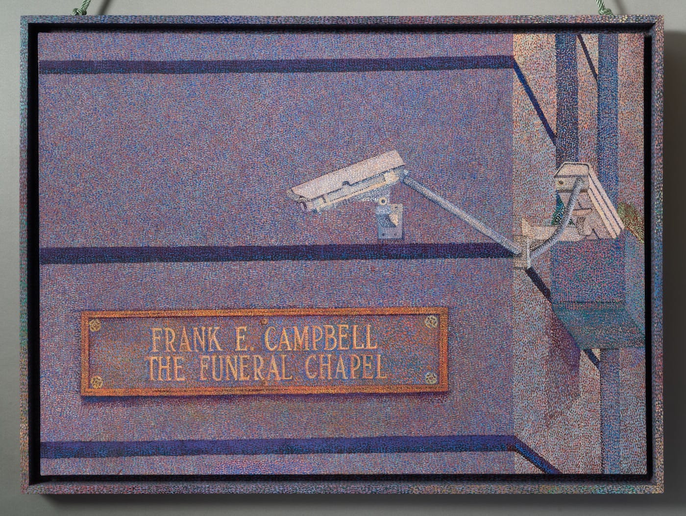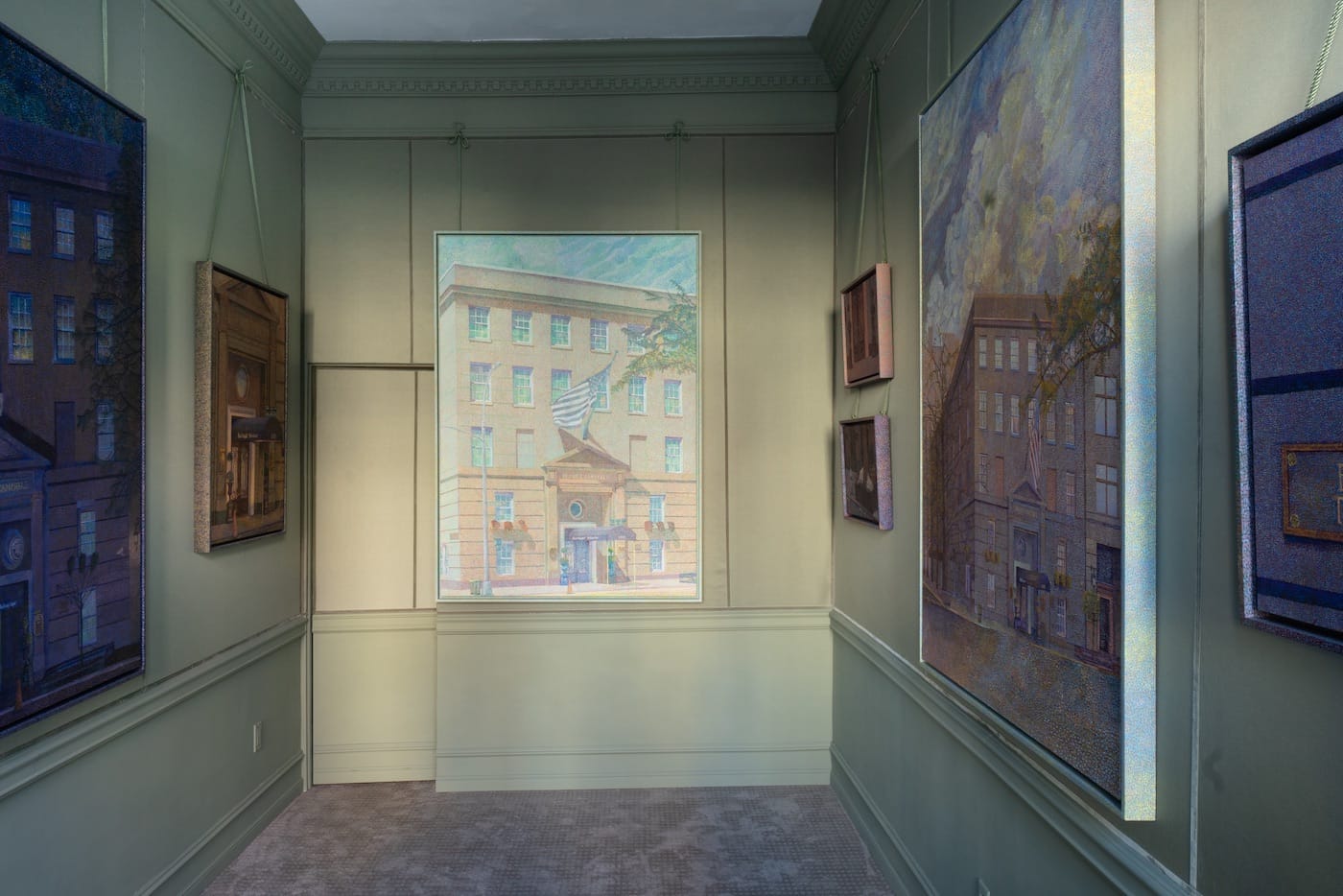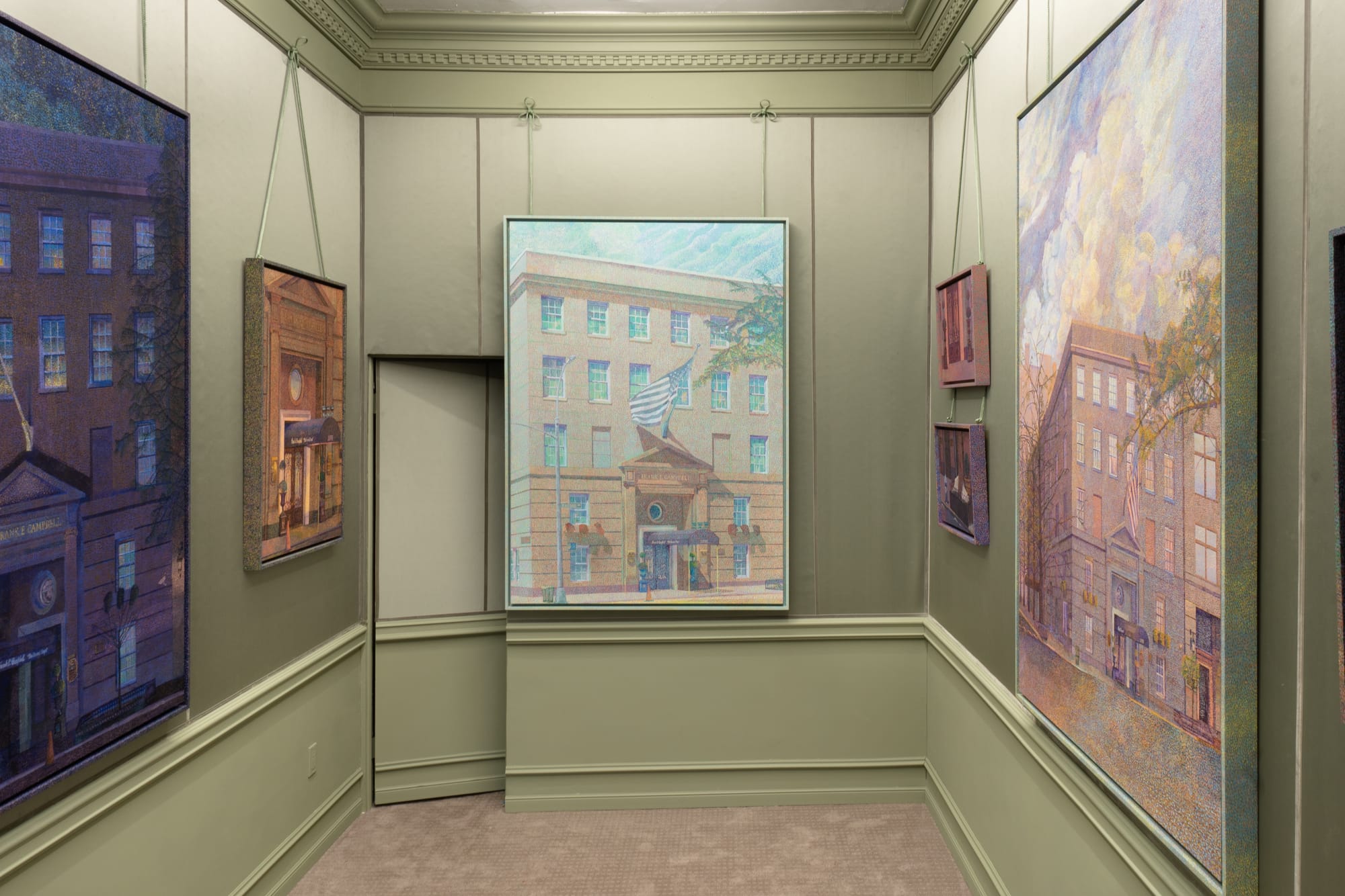 The exhibition features eight paintings by the artist, each depicting the Frank E. Campbell funeral home from different angles in an excruciatingly detailed pointillist style that recalls the work of neo-impressionists like Georges Seurat, Paul Signac, and Henri-Edmond Cross. Accordingly, Talmadge has costumed the white cube gallery’s normally stark walls with anachronistic, mint-green wallpaper and plush gray carpeting. The result is an eerie amalgamation of funeral home finery and the extravagant details of a 19th-century French artist salon. The subtext here is wonderfully mordant, if also flip. Through her decorative details, the artist seems to ask: What’s the difference, really, between a funeral parlor and the artists’ salon?