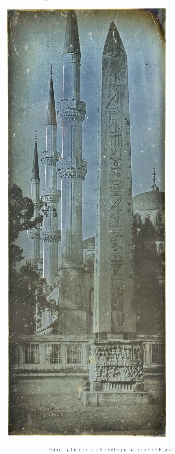 Monumental Journey does a good job in addressing this context. We see multiple lithographs made from Girault’s photographs, used to illustrate his volumes on Islamic architecture. We also see two prints from Excursions daguerriennes, including an etching of the first photograph ever taken of the Parthenon. In it we see that the mosque built by the Ottomans during their control of the city is still standing. By the time of Girault’s photograph three years later, the mosque is gone, replaced by scaffolding — the work of restoring the original classical grandeur of the Acropolis was well underway. The exhibition labels also note, very astutely, why many of these early photographs are now missing. Because they couldn’t be reproduced, daguerreotypes were often seen as incidental to the truly important product, the lithograph, etching, or engraving made from them. In fact, the process by which many lithographs and engravings were made damaged or destroyed the daguerreotypes. We get a glimpse of this damage in Girault’s daguerreotype of the Hippodrome in Istanbul (the racetrack of the ancient city, featuring an Egyptian obelisk moved here by a Byzantine emperor in the fourth century). Incised vertical lines are visible along the left edges of the minarets in the photograph — likely (as pointed out by the museum label) guidelines for the production of a print.