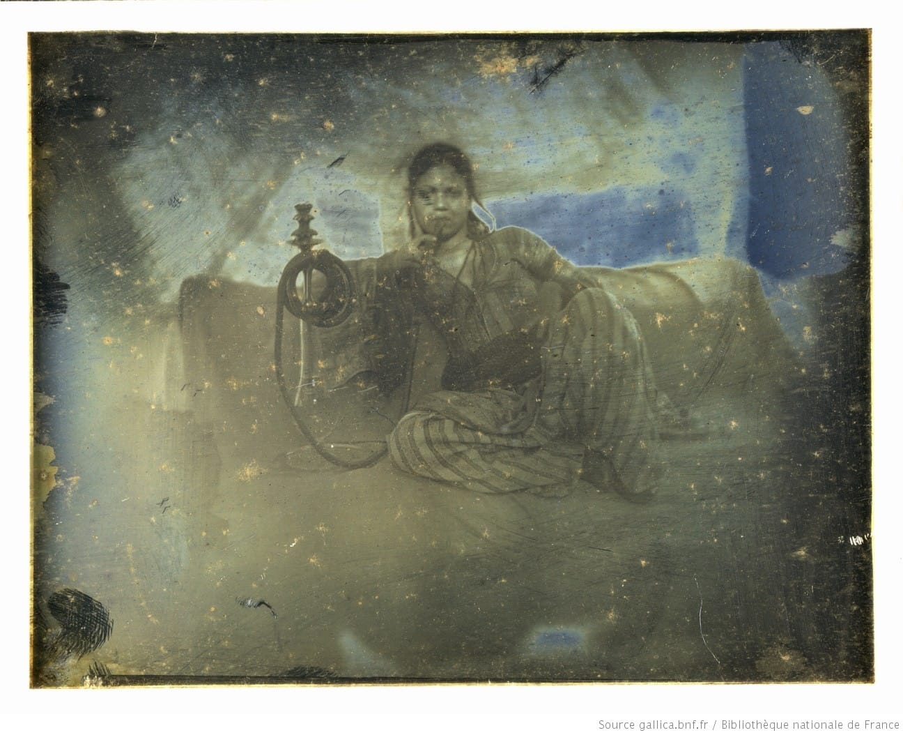 For anyone (like me) who hasn’t seen daguerreotypes in person before, this exhibition will be a revelation. What struck me first is how small they are. Daguerreotypes are not prints from negatives — they are plates with positive (but reversed) images produced directly in the camera. This means their size is restricted by the camera and plates in use. Even using oversize cameras, Girault’s images appear small. But this is also because he used many plates for multiple, separate exposures and afterwards cut them up. Even as miniatures, though, the daguerreotypes are remarkably detailed. At their best they are beautiful, even haunting images. This effect is intensified by the fact that many of them are not purely black and white, but have strong yellow and blue hues. Like many other practitioners, Girault gilded many of his plates after developing them, both to stabilize the image and to make them more striking. Many of Girault’s plates were also overexposed, in what appear to be attempts to capture details in bright, outdoor lighting, with the blue Mediterranean skies bleeding into the images.