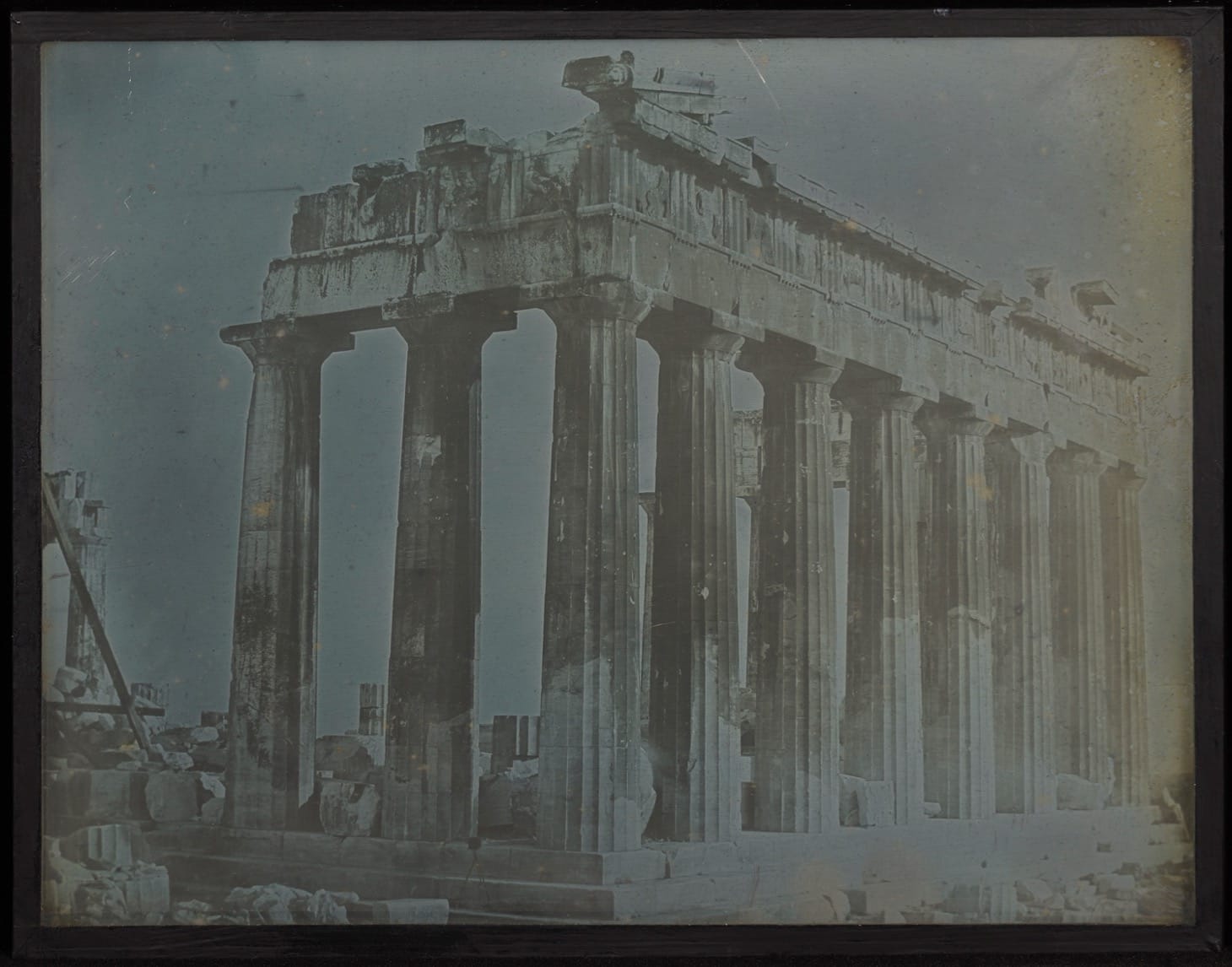 In his photographic work, Girault combined two very separate strands: artistic and scientific. Like Daguerre, the inventor of the daguerreotype, Girault was a painter. Daguerre conceived of his photographs as individual, one-of-a-kind works of art; Girault followed through on this. His special process of multiple exposures turned the square plates into a set of remarkable panoramas and vertical views. Even when photographing monuments that were popular subjects of early daguerreotypes, Girault finds unique views — like the tops of circular buildings, such as the Temple of Hercules Victor in Rome or the Tower of the Winds in Athens.