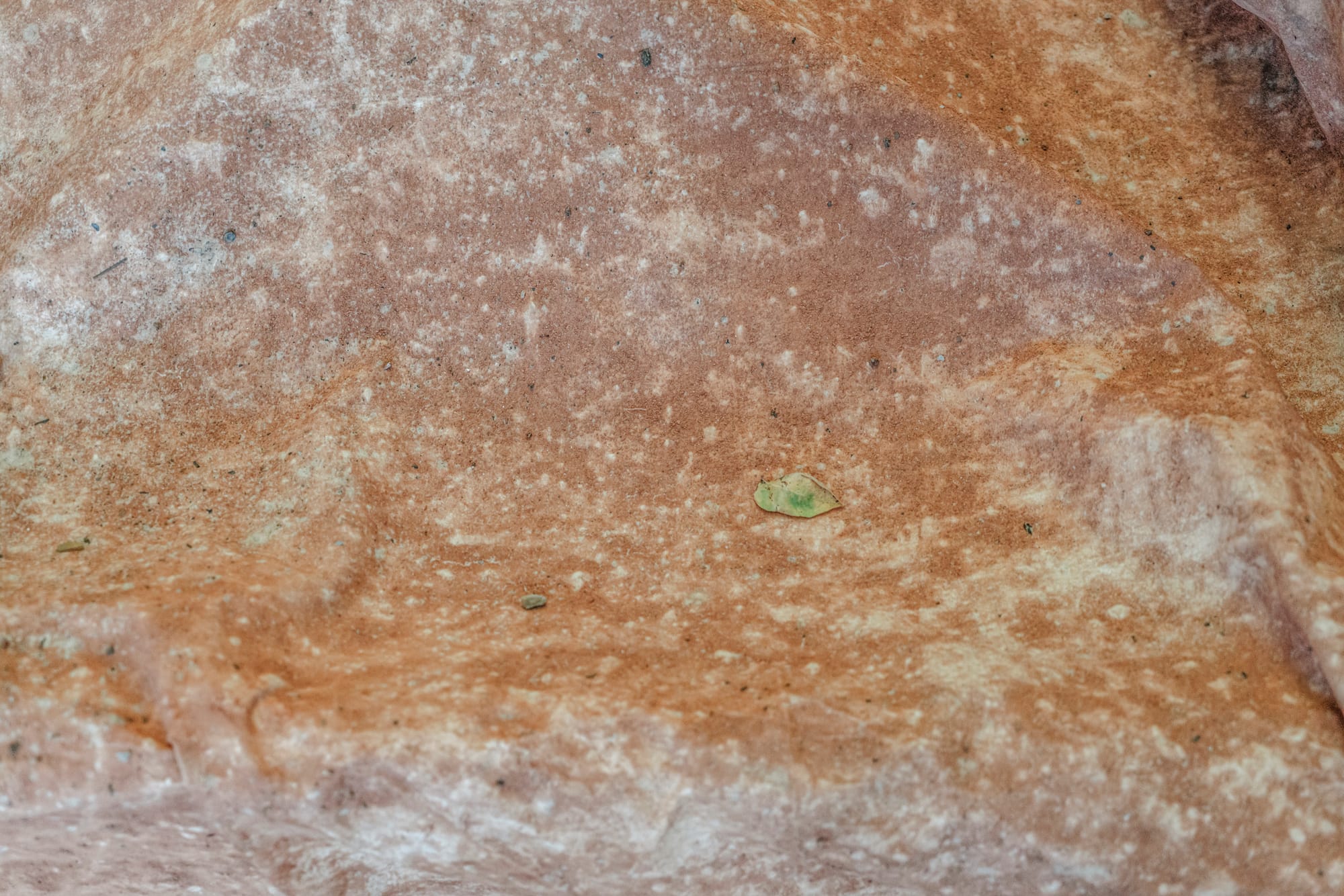 Last summer, Nasser traveled from Beirut, where she lives, to record the grotto and the ruins. A short video, viewable on the Ren’s website, reveals the beauty of the natural environment and its use as a local leisure and pilgrimage site; the neglect of the temple, unprotected and covered in graffiti; and the palpable physicality of the artist’s process. Indeed, she was forced to scrap two of her six planned days of work when she broke her foot on the cavern’s slippery rocks. Nasser was primarily making charcoal rubbings of the cave walls and temple surfaces, traces that show up as stippled marks on the installation fabrics, later stained with local clay and washed in the river.
