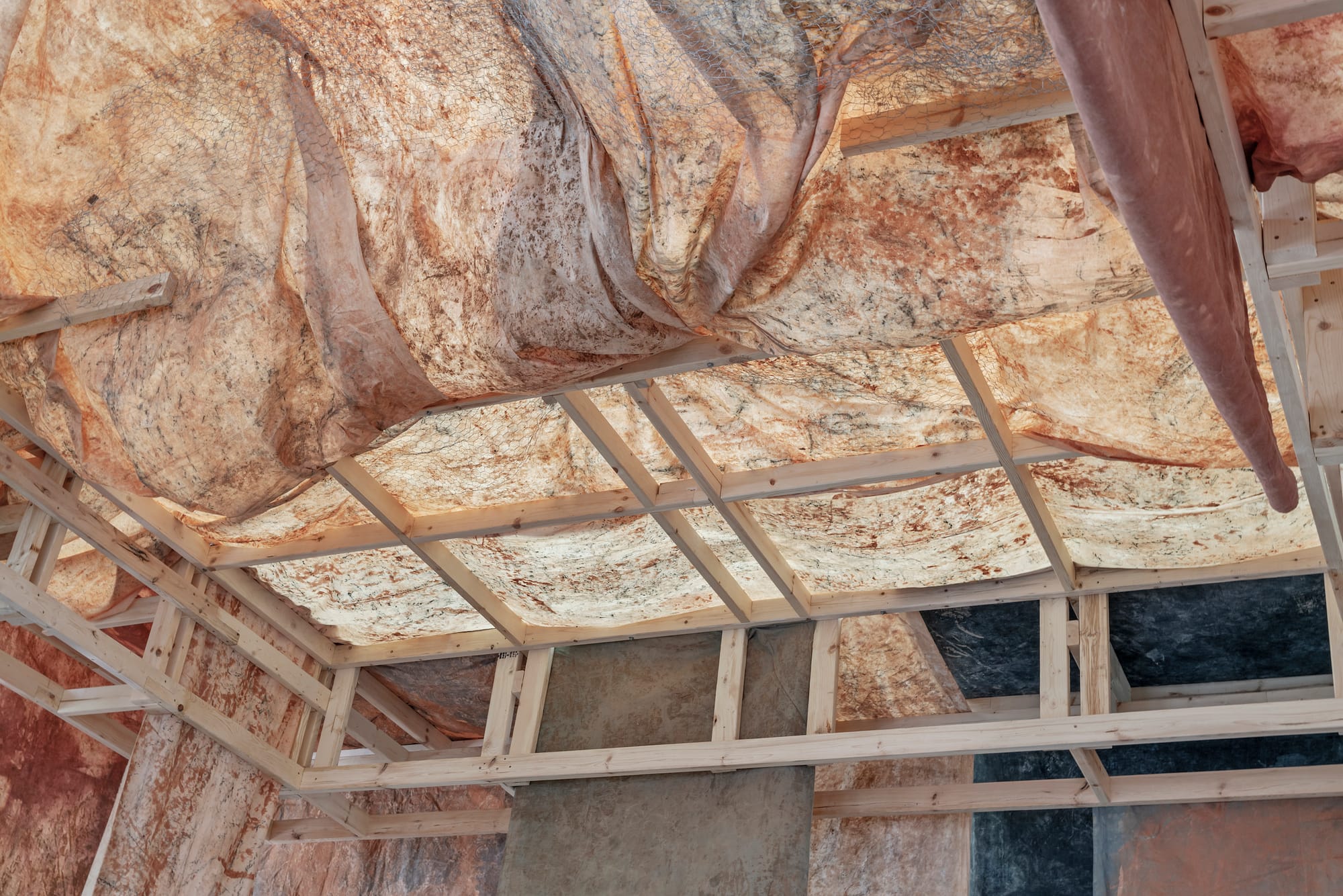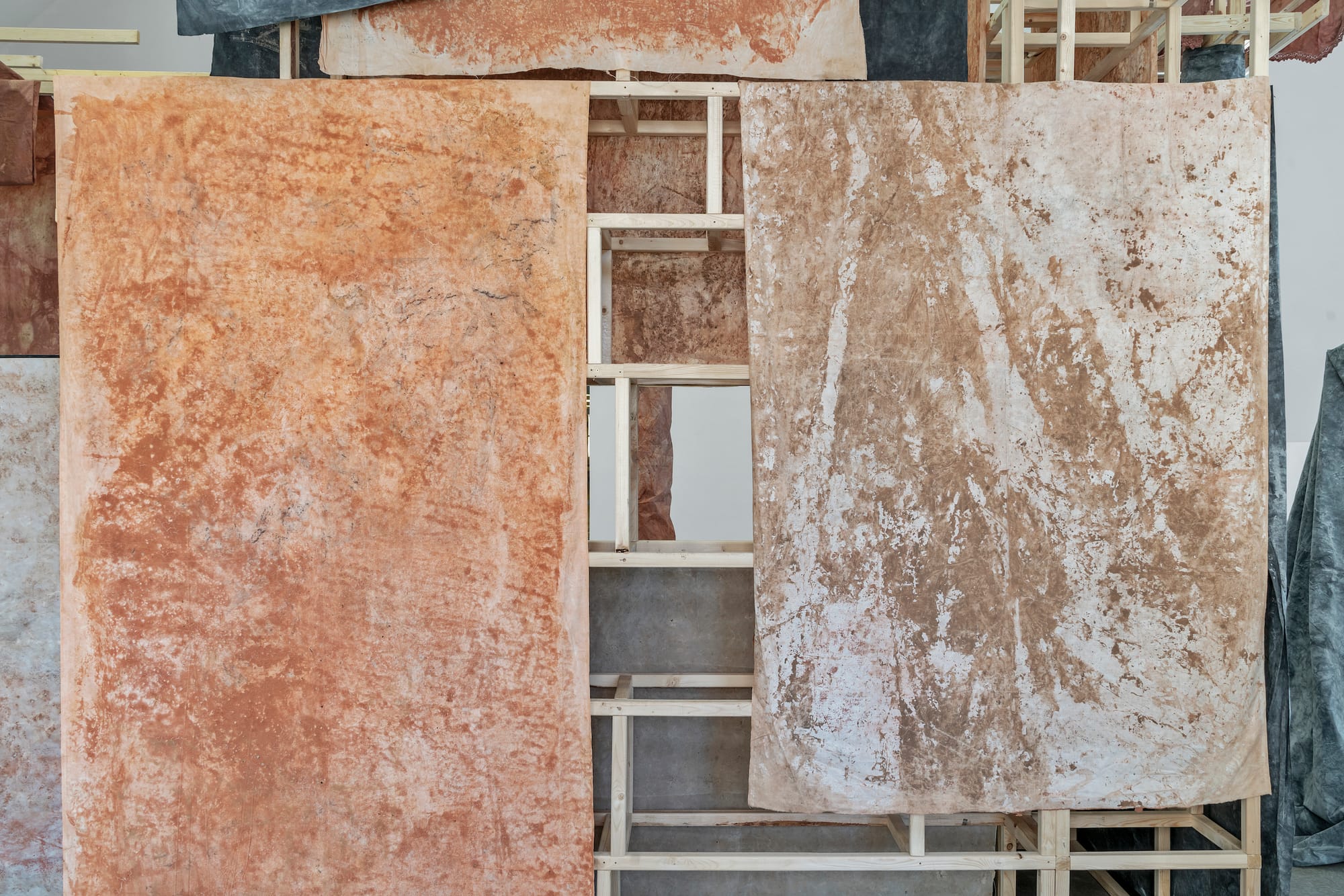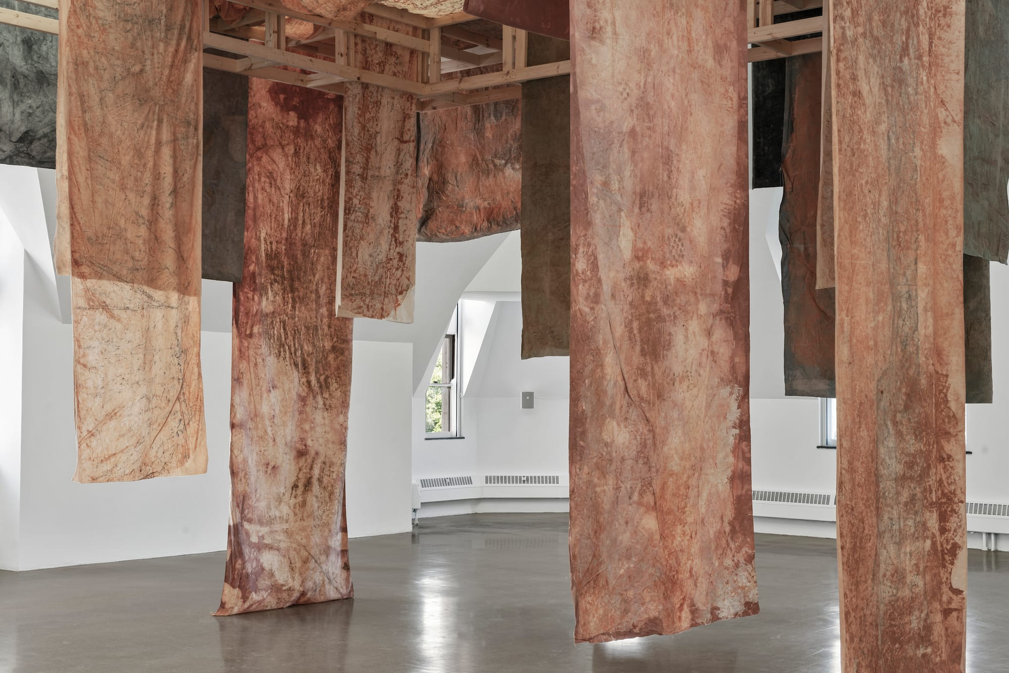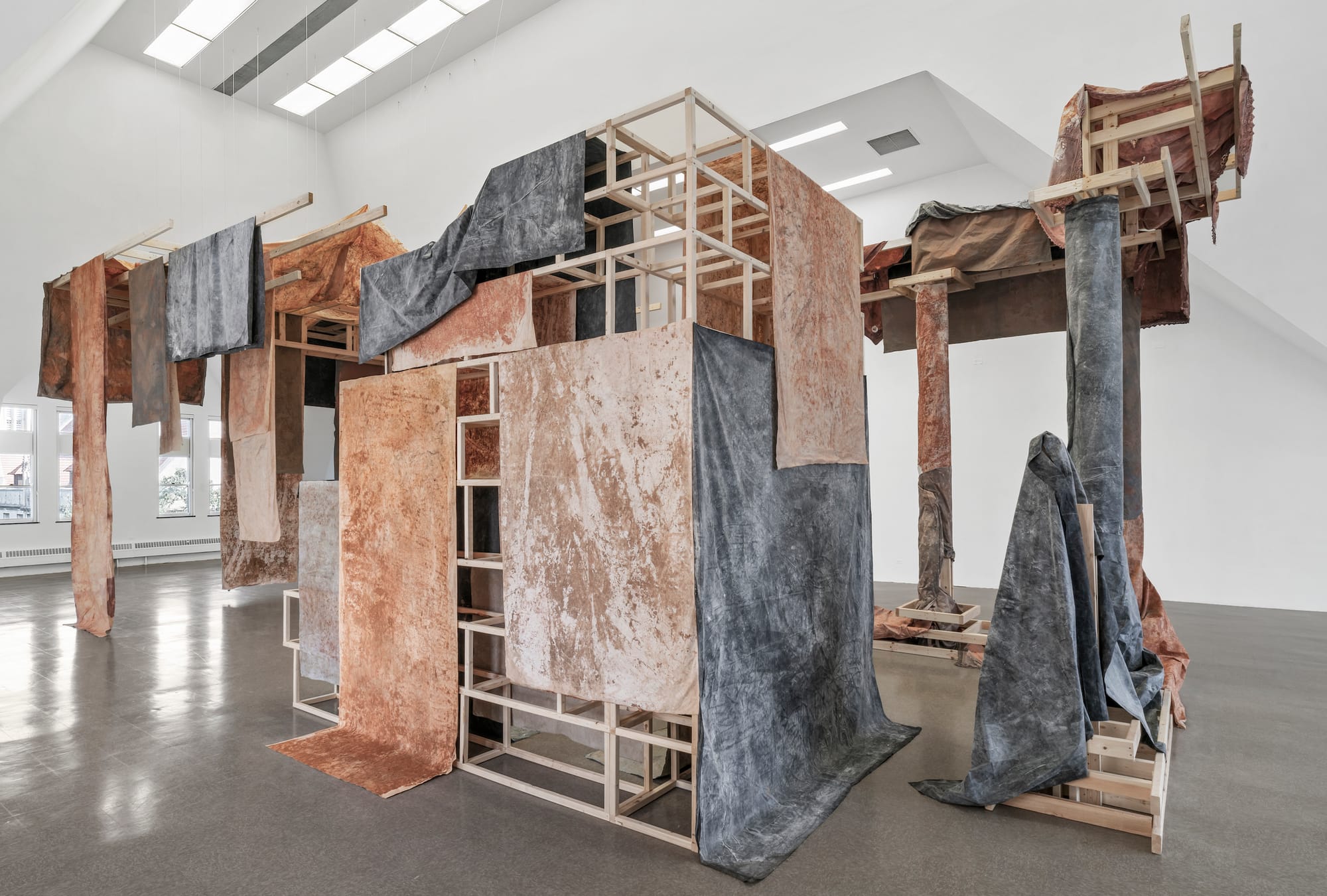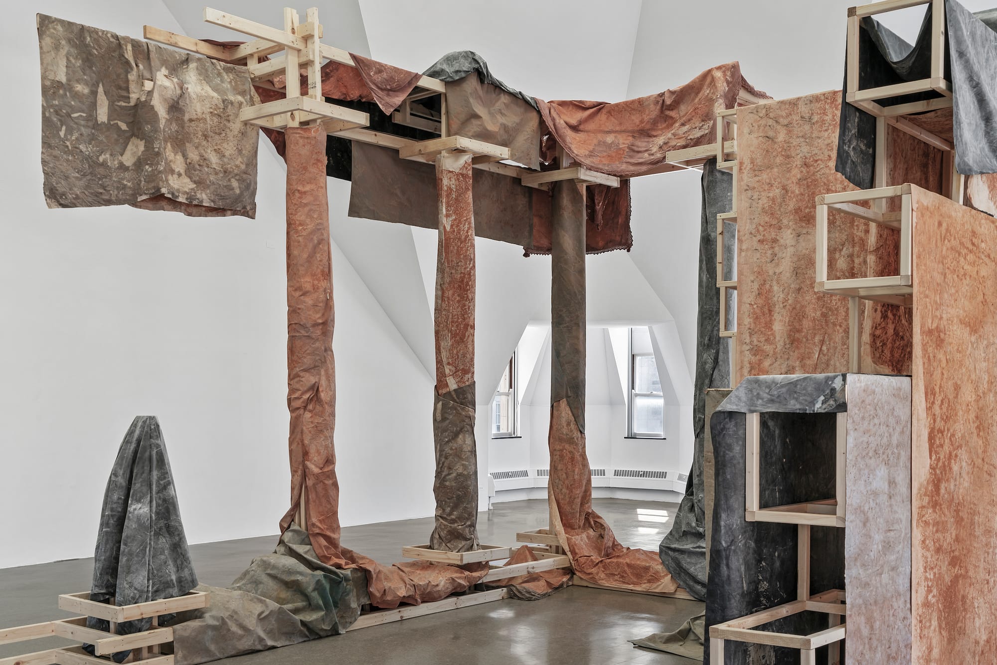 Adonis River consists of many lengths of cloth draped around simple wooden scaffolding set up in the cathedral-esque gallery of the Ren, a 108-year-old Kunsthalle that extends high into the eaves of a neo-Gothic building on the University of Chicago campus. The raw cotton, secondhand household linens, and black flags (from the Shia mourning holiday of Ashura) have all been flecked with dark marks and dyed somber shades of mud red and ash gray. Their supports, built from two-by-fours and stretcher bars, are of three types: pillars that rise from the floor; modular rectangles that form a corner wall; and horizontal bars of different lengths, suspended from the ceiling like a partial roof. The textiles are arranged accordingly, wrapped around the full columns for architectural solidity; veiling the broken ones like small figures; pinned to the geometric structure to form half walls; slung over the beams like drying laundry or tent shelters, but also scrunched and peaked across them to create a cavern. There is music, too: an hour-long four-channel piece made in collaboration with Mhamad Safa, of muffled prayers and silent interludes.