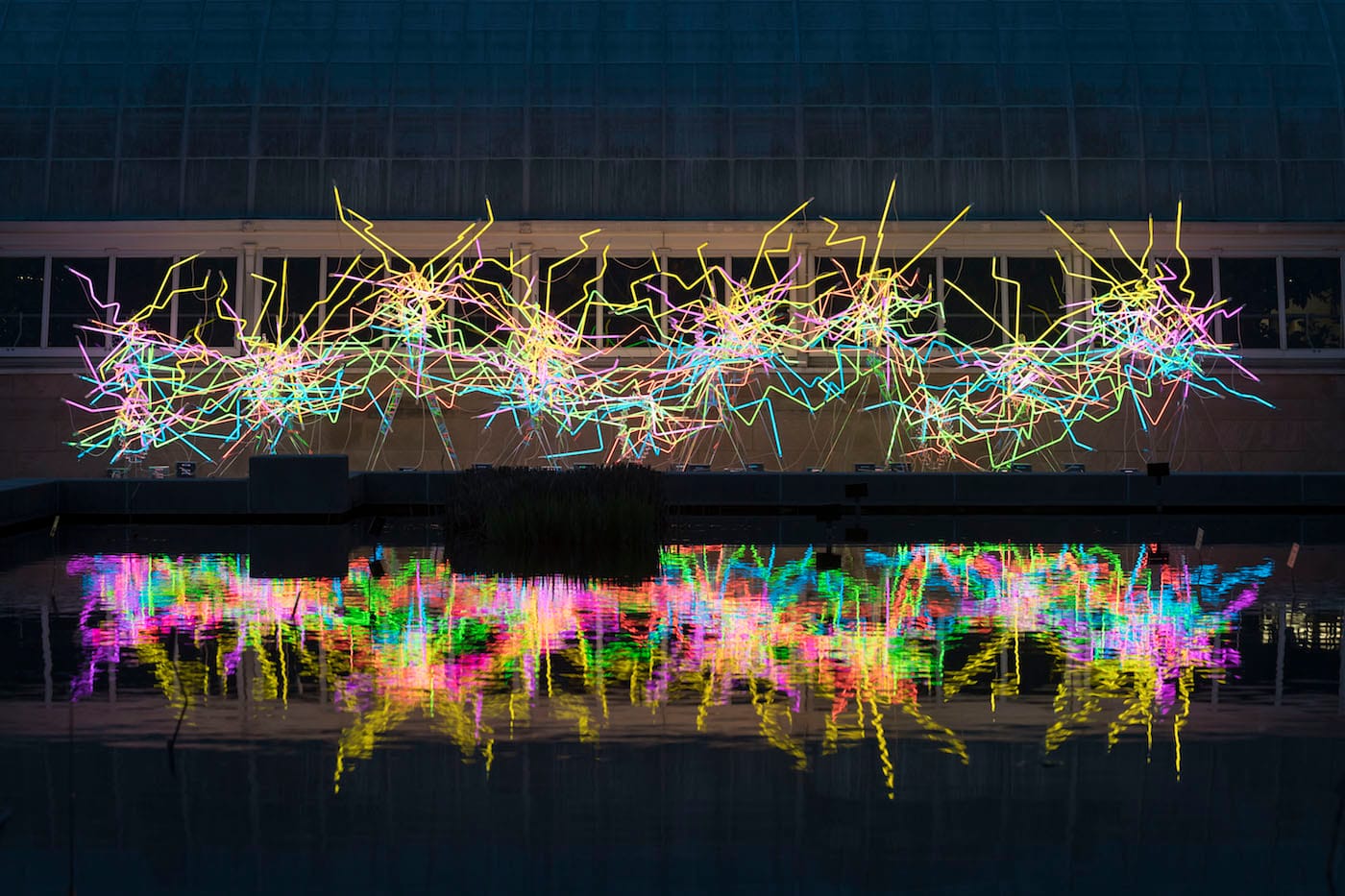 But the most striking thing about “Koda Study No. 3” is how starkly it contrasts with the rest of the show. Alongside the bold colors, baroque forms, and showy gestures of Chihuly’s mature style, the subdued Minimalism of the “Koda” rectangles seems the work of an entirely different artist. The large scale and visual intricacy of sculptures such as “Sol de Citrón” (2017), a fifteen-foot diameter lemon yellow glass koosh ball that greets visitors at the conservatory entrance, and “Neon 206” (2017), a long briar patch of glow sticks that light up at night, is undeniably eye-catching. But eye-catching is not the same as appealing. Much of Chihuly’s work is the sculptural equivalent of the sartorialist who dresses head-to-toe in statement pieces: it’s bound to attract attention, but not always in a flattering way.