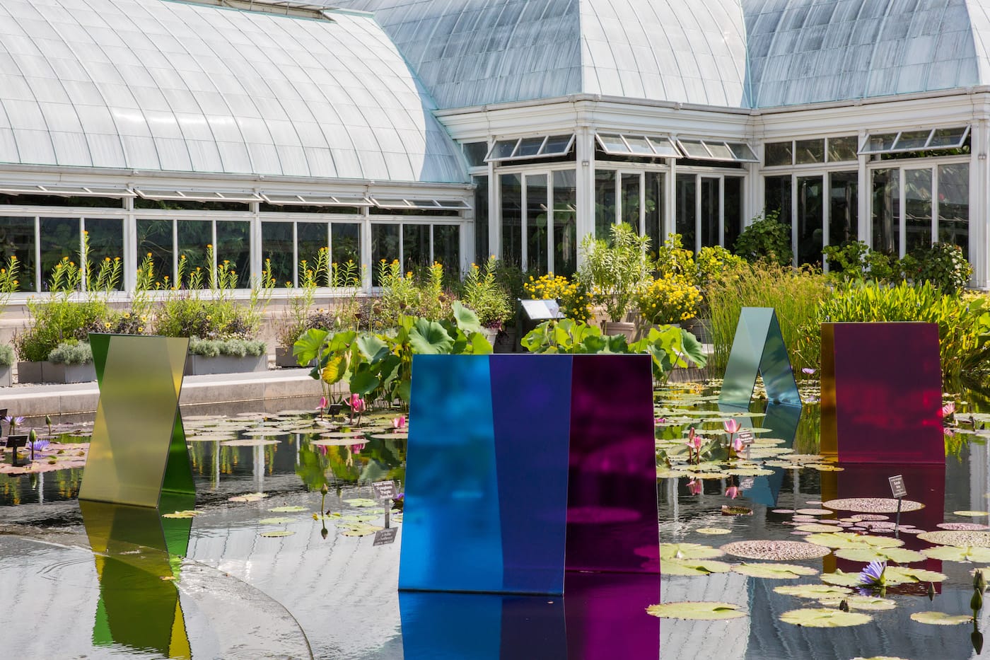 While Chihuly’s rectangles do not break new artistic ground, now or in 1975, their arrangement on the pond is pleasing, subtle, and evocative. Tinted in primary colors that are faint at times and dark at others, depending on the light, the glass panes play well off one another and the pond plants. The panes’ flat, rectangular shapes visually echo the pond’s many lily pads. With their hard angles and symmetrical positioning, the rectangles are not trying to pass as organic and yet they suit — enhance, even — the pond’s environs. It’s a thoughtful and well-conceived arrangement.