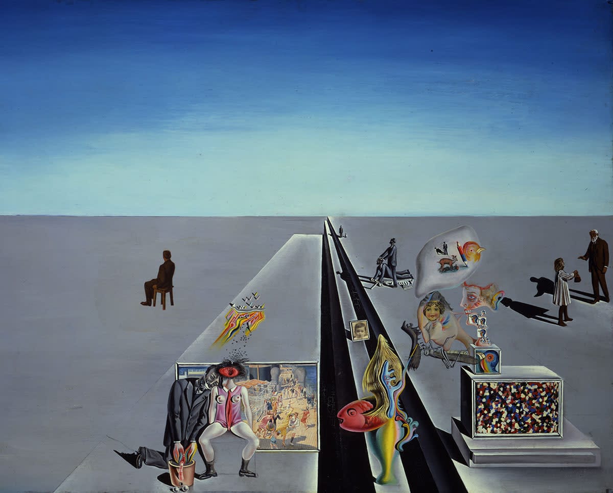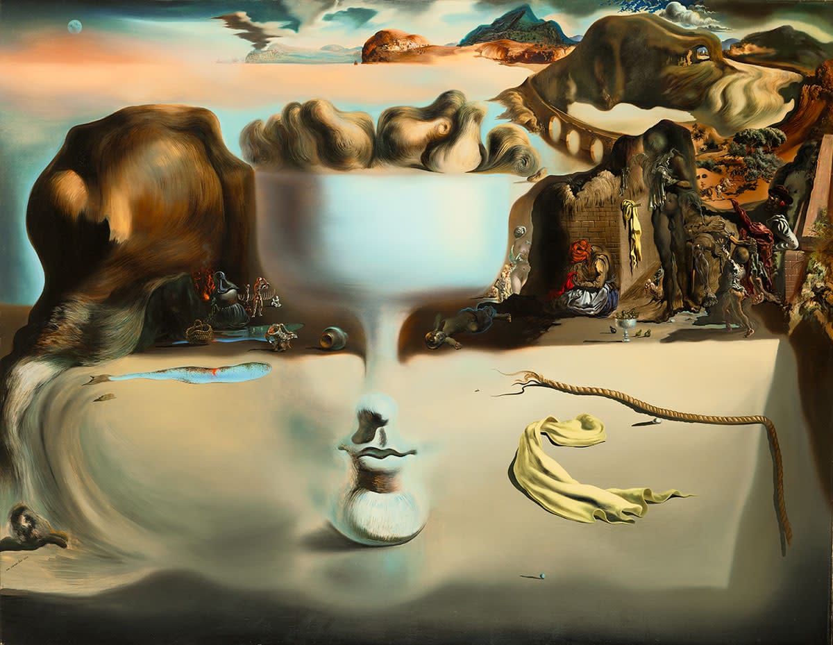 Inevitably then, the show is a mixed bag from the start, though this is by no means a bad thing; the show refers to a “rich and rewarding exchange,” rather than try to prove a direct collaboration, allowing a refreshingly off-piste ride. Dalí travelled to Paris, encountering Duchamp there in 1930; their friendship however blossomed after Duchamp’s trip to Spain in 1933, as photographs show Duchamp, Dalí, and Gala, his lover then wife, at Dalí’s house in the Spanish fishing village of Portlligat. Throughout the 1950s and ‘60s, Duchamp rented a summer apartment down the road in Cadaqués. Photographs of the pair naturally indicate holidaying chums rather than artistic geniuses locking horns. A rare non-Cubist, non-Surrealist painting by Dalí of 1922–23, titled “Lane to Porttligat with View of Cap de Creus,” is a straightforward, even vaguely impressionistic landscape showing the parched dusty roads and brilliant sunlight. Presumably, an early Duchamp painting, “St Sebastian” of 1909, is placed next to it as a similar exercise in capturing searing light on the baked figure of the saint. More directly connected are two portraits of the artists’ fathers: Dalí’s of 1925 and Duchamp’s of 1910. It’s interesting to see these early paintings before the main ‘signature’ style emerges for each artist (in Duchamp, of course, this being abandoning paint altogether).
