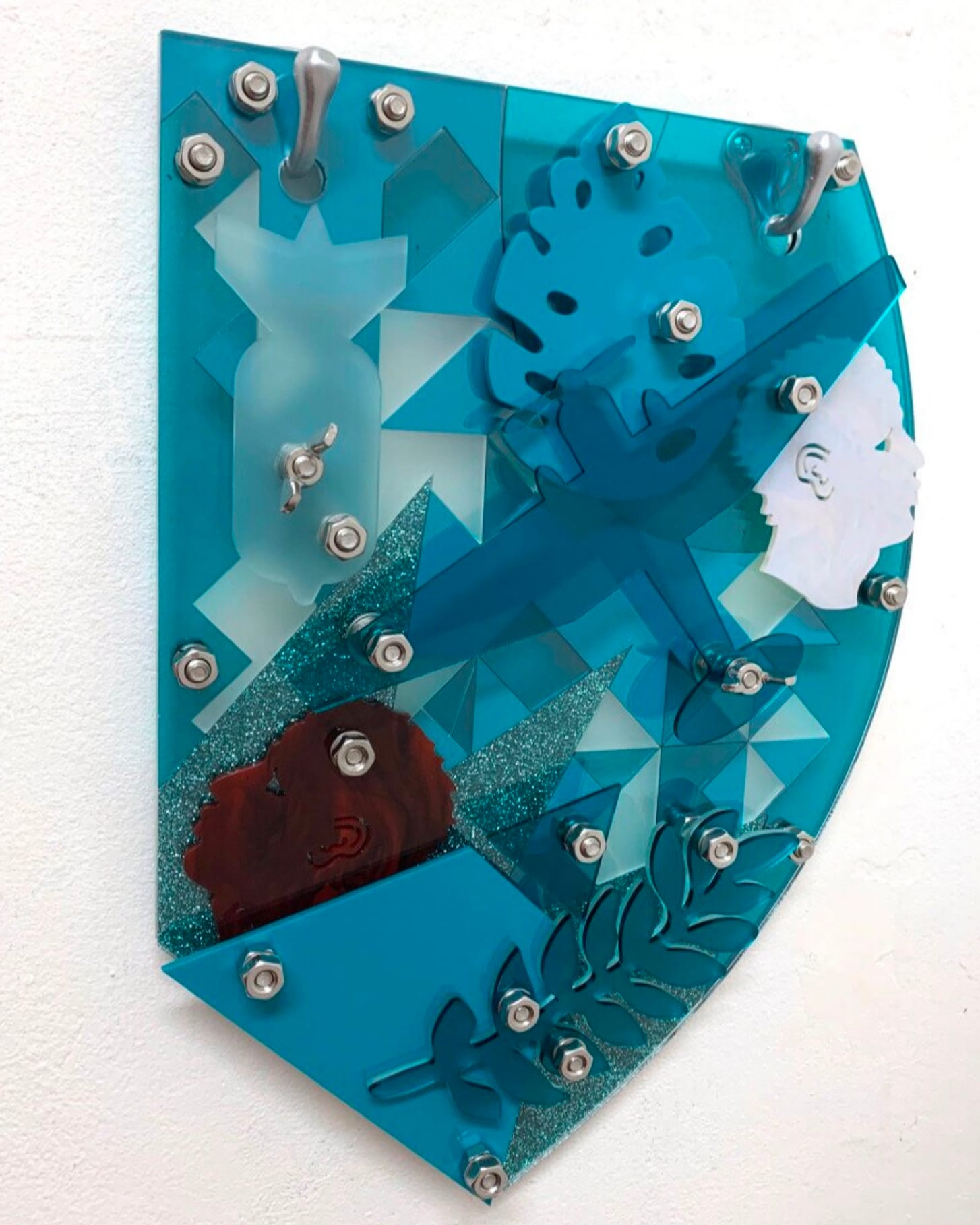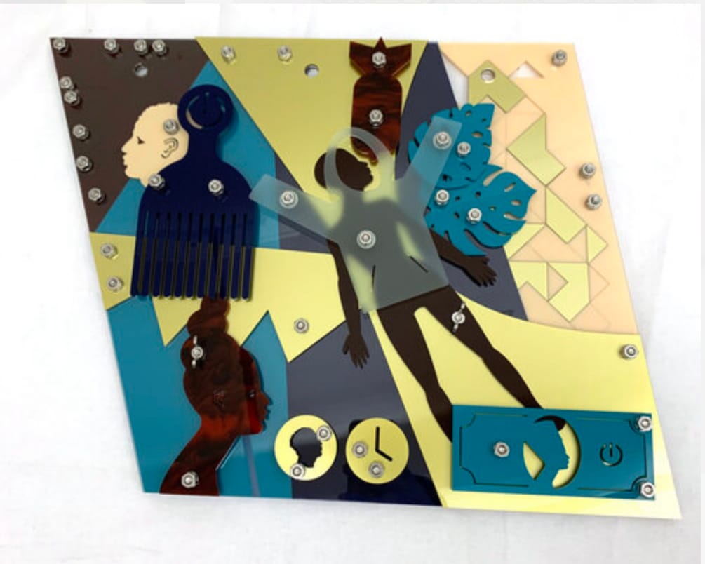 Davis pushes against the boundaries of the two-dimensional collage format; works extend from the wall into layered sculptural compositions. The steel nuts and bolts that fasten the laser cut plexiglas components let light and air through the layers. The work invites the viewer to read the narrative in Davis’s language, contemplate, and ask questions. Most importantly, they invite viewers to join in on a conversation nearly 100 years past due.