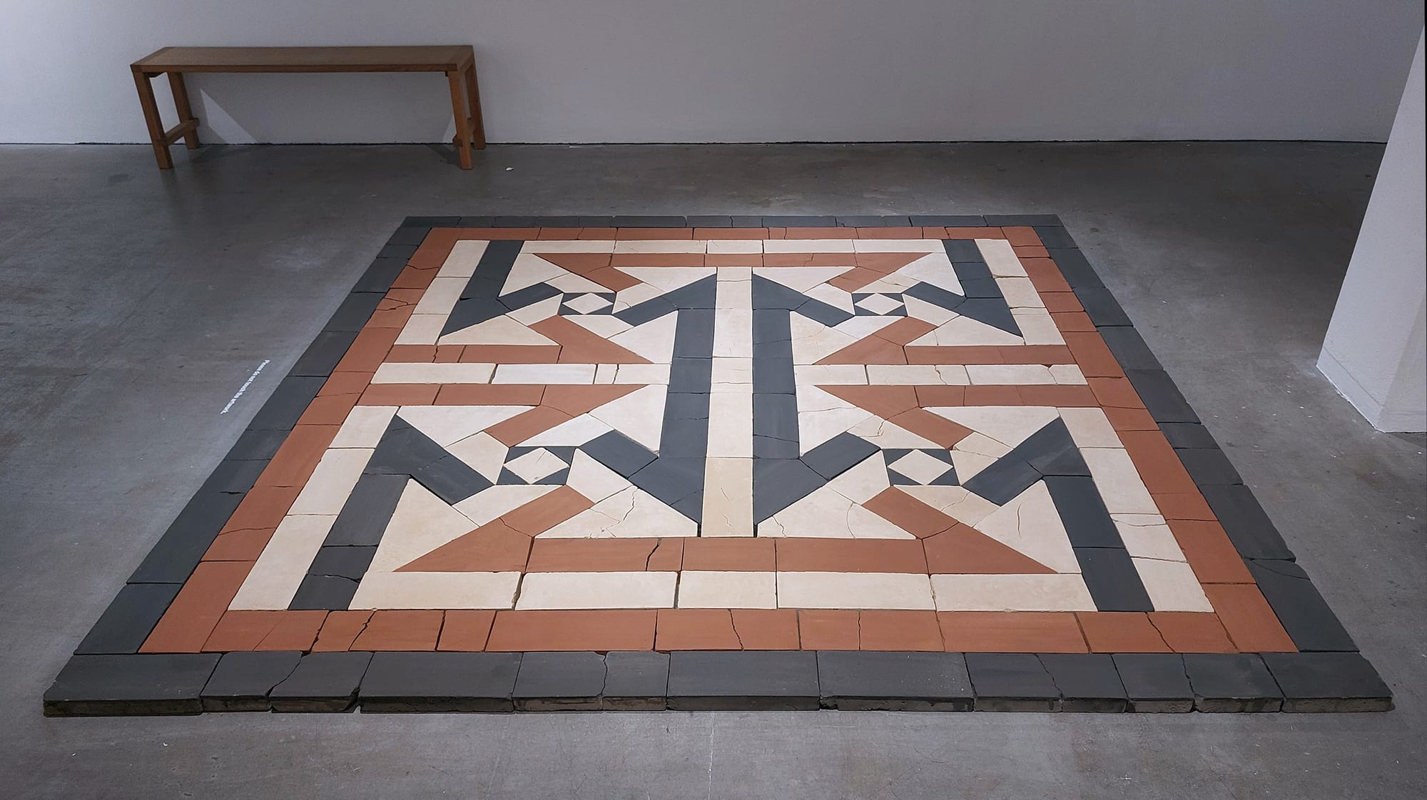 For this exhibition, Awartani also produced “Standing by the Ruins” (2025), a new commission recreating the intricately patterned floors of the Hamam al-Sammara in Gaza, one of the oldest bath houses in the region and now believed to have been destroyed by Israeli bombs. Like much of her other work, the installation forms a meaningful act of remembrance and care — but it also shows the frustration and futility of being forced to “stand by” and watch from afar as Gaza and its people fall to ruins.