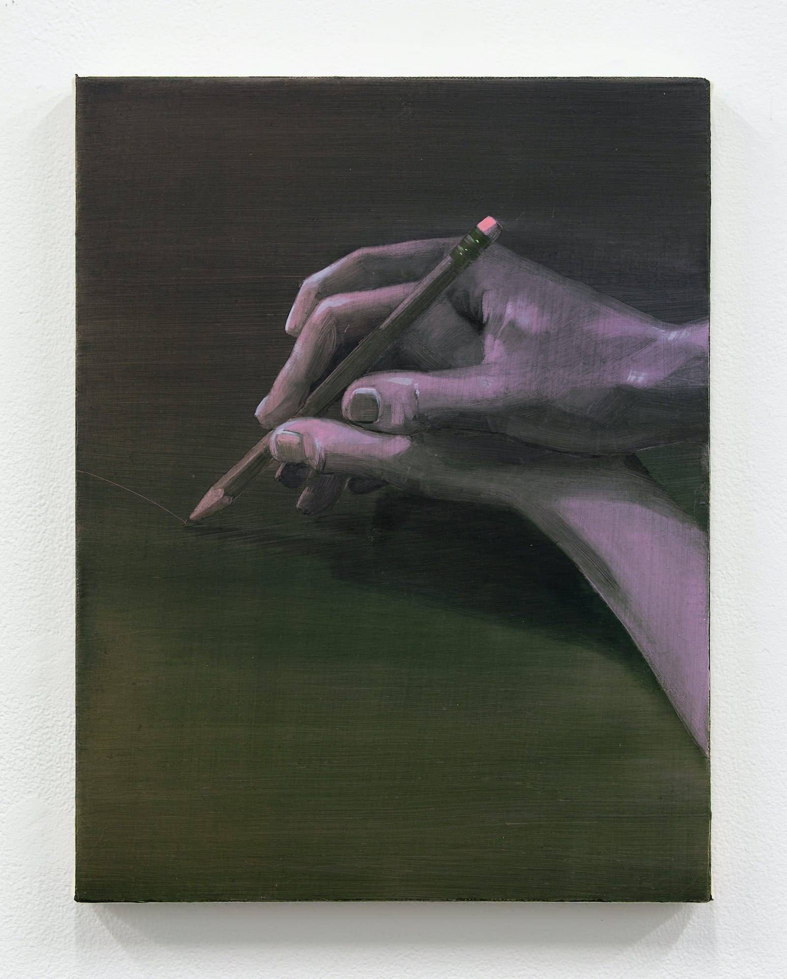 Simultaneously alluding to Gross’s surgical demonstration and to Eakins’s portrayal of himself in the act of sketching it, “Demo” (2022) portrays a teal hand dragging a pencil across a piece of paper to draw a razor-thin line. The paper is held in place by additional sets of hands that impress their thumbprints on the page, learning haptically as they produce their own relatively unstudied marks. In “Trace” (2022), one hand guides another in drawing a line directly on the canvas. The small, strangely intimate work simultaneously deploys painting's illusionism and gently pierces a hole in that illusionism, toggling between a phenomenon and its depiction, or a sign and its referent.