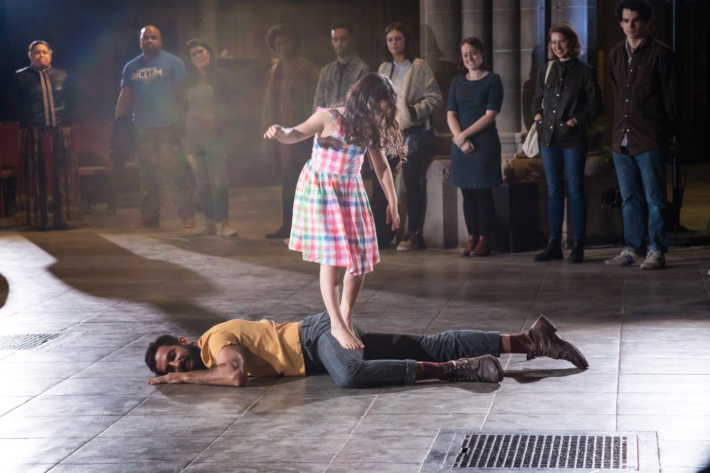 The first performance featured Wilson’s … they stood shaking, performed by his Fist and Heel Performance Group, along with works by David Brick and Germaine Ingram. Rather than sidestep the murals’ magnetism, Brick began the performance by setting the audience on a silent single-file tour through the sanctuary, led by his seven-year old daughter. After a close up view of the murals, the group formed a circle where the two performed the first piece: a duet that riffed on asking for and giving consent as they requested permission from each other to move and make physical contact, beginning with the question “May I enter the space?” Their father-daughter relationship tilted the work toward interpretations related to parenthood, gender, and power, but it also resonated with our presence as a secular audience in a place of worship.