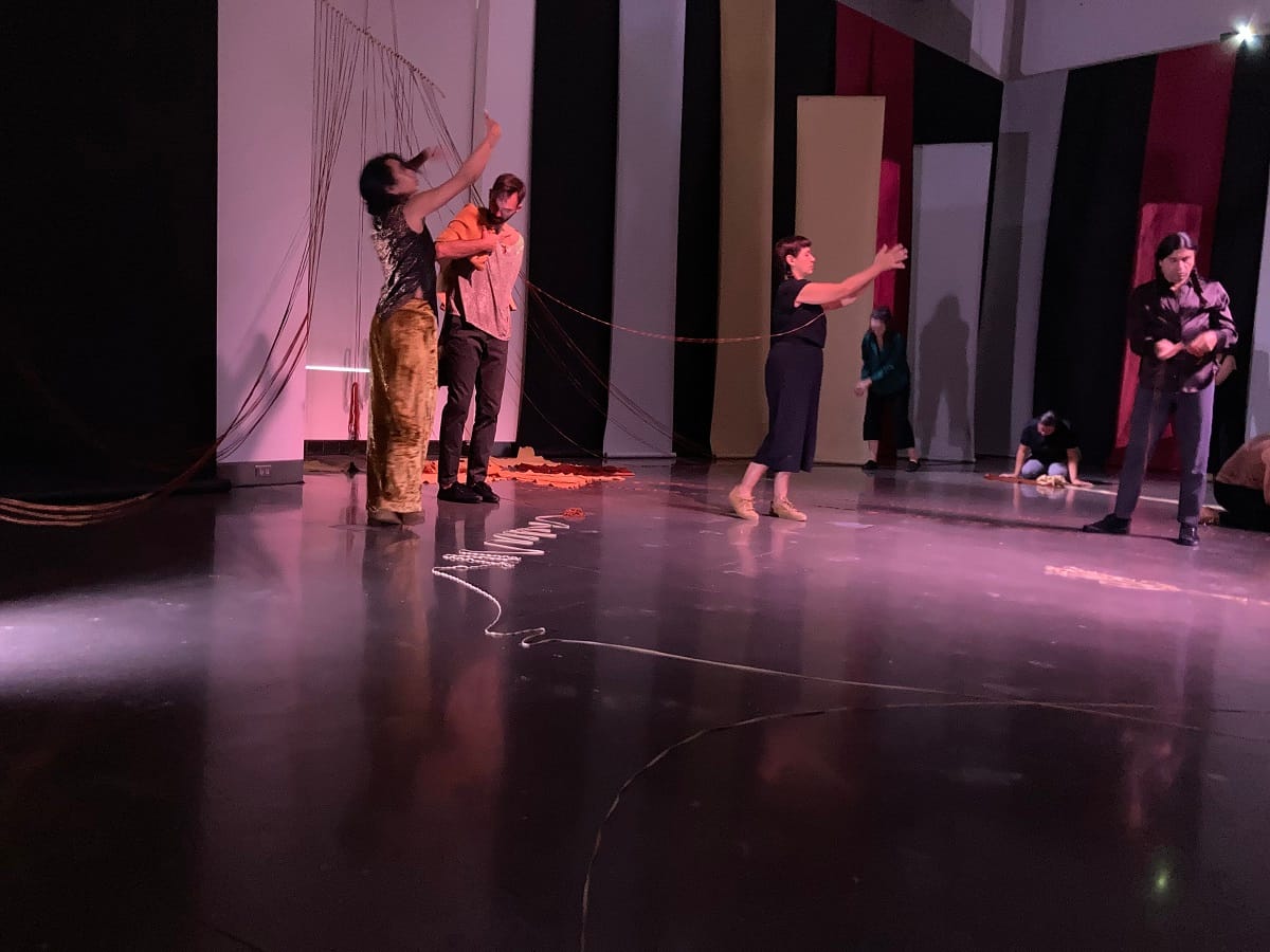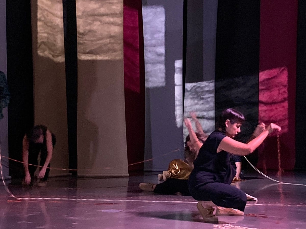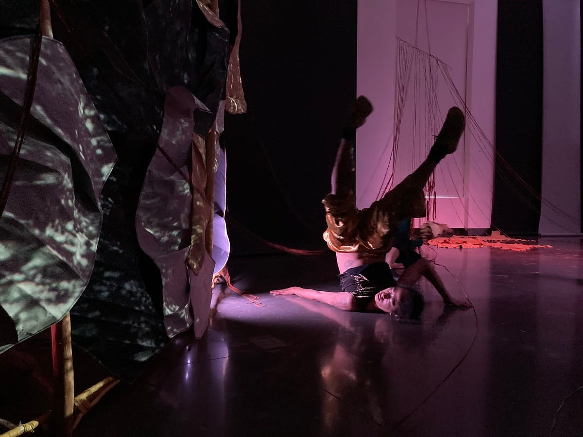 With slow, focused movements, the dancers distribute cords that have been spread out on the floor to the audience. The cords elicit bodily viscera, which mirrors the movements. As Richomme’s sounds of crashing water and echoing, cracking noises fill the room, the dancers undulate, rock, and jiggle. They reach toward a space of release, tapping primordial energy as they interact and build communion with each other. Through minute and specific fluid movements, they engage in tasks aimed at care and solace — whether that be through touching one another or taking space for emotion, relaxation, and grief.