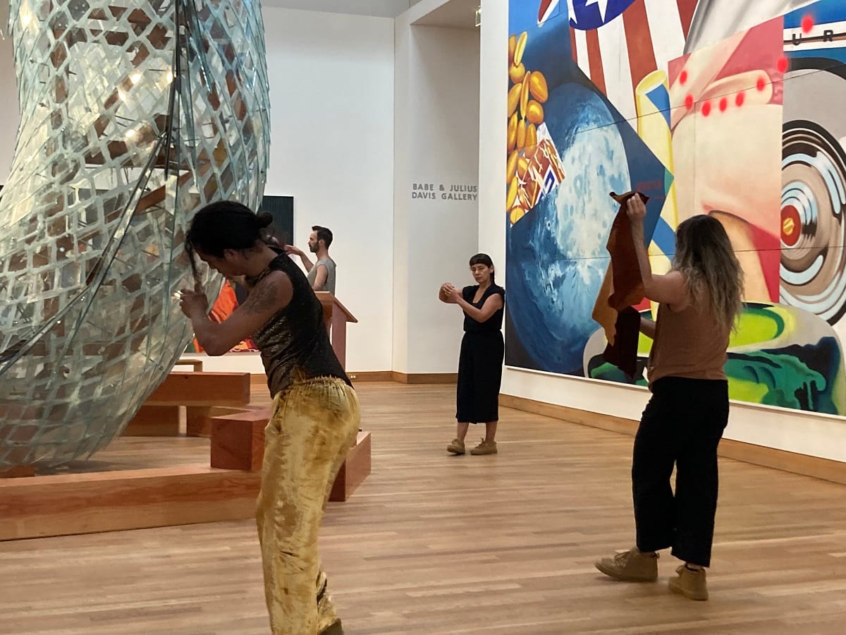 At the Weisman, the dancers begin with a hypnotic promenade. The prologue through the museum’s lobby and front gallery emits a presence of ritual. Bodies move one by one as if through water. The dancers’ eyes have a soft focus, and some carry leather hides or stringy cords. One holds cloth to their face, in a gesture of grief. Meanwhile, François Richomme’s densely layered sound design begins by evoking chirping sounds and whispering wind.