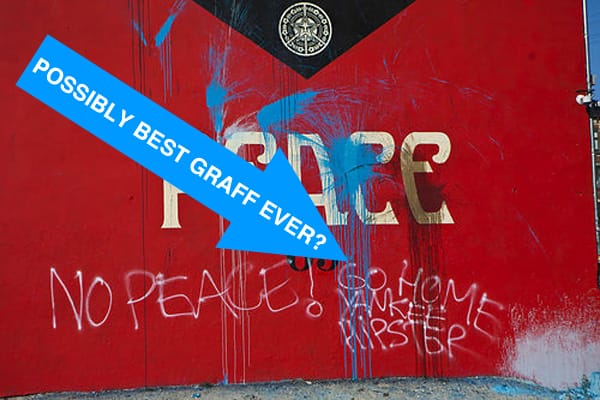 According to the Guardian, Fairey inadvertently stepped into a political controversy when he placed a “peace” mural on a site that is still rife with conflict and in the process he enraged the country’s leftist anarchists. Since it was completed, his mural has been vandalized with numerous slogans but one stands out as perhaps the best diss of a Fairey mural known to humanity, “Go Home, Yankee Hipster.” Just.WOW!