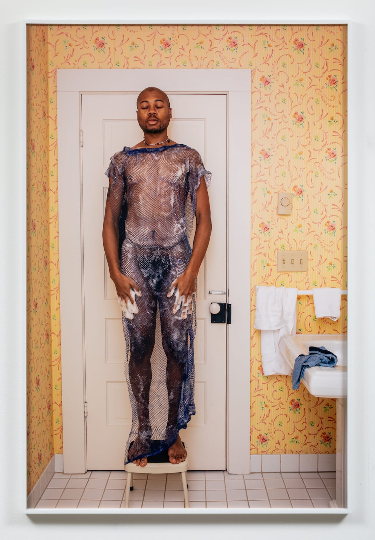 I like to expand narratives of Blackness and queerness through the lives of those close to me. Whether I’m photographing, working with video, or making weavings, the way I feel in my own body shows up in those works. I have a photograph titled “Granny and Paw Paw’s Guns" (2021), for example, where I am standing outside my granny’s house wearing this long, black Wales Bonner dress and proudly holding my grandparents’ rifles in resilience. In another image titled “Like the Floating Wet Lotus of the Nile’s Fertile Ground, Burying You Was Never An Option” (2022), I am standing on a stool in a bathroom wrapped in this blue African washcloth. I’m covered by suds which allows the washcloth to cling to my body like a dress.