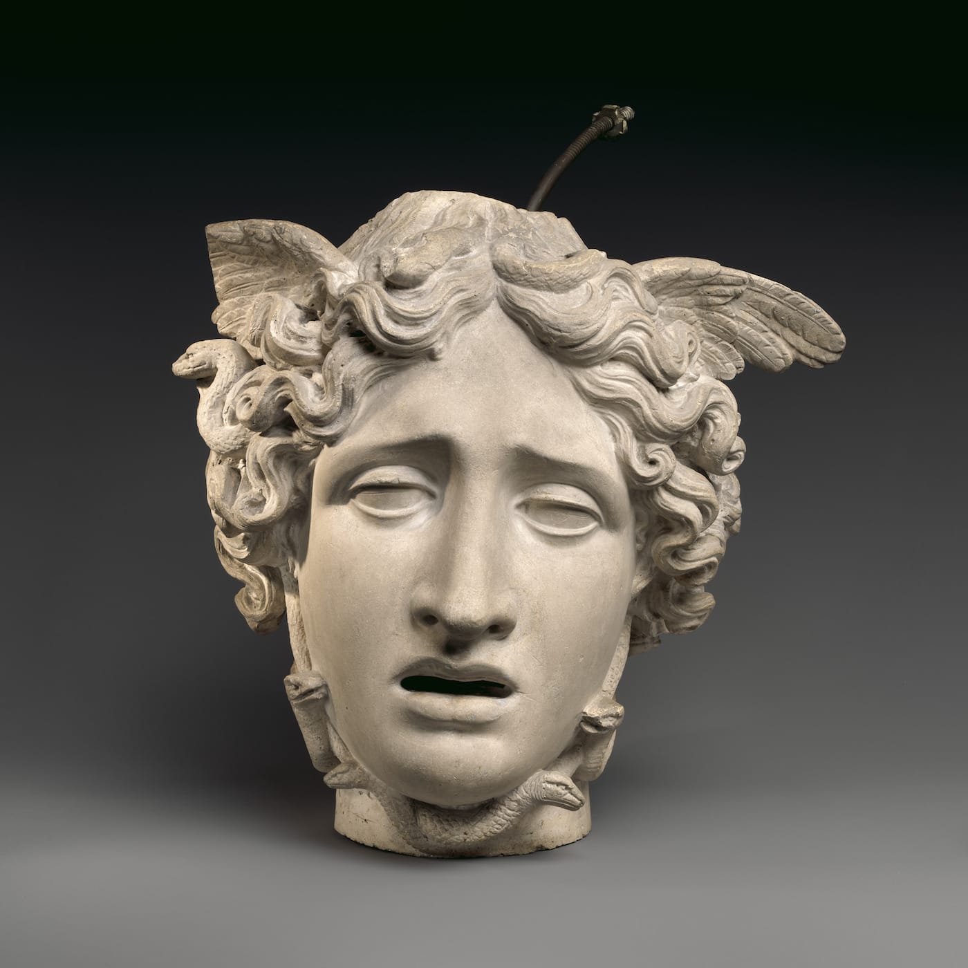 On a chariot-pole finial from 1st-2nd century Rome, Medusa is almost angelic with her flowing hair (and a pair of snakes peeking through her tresses), yet her penetrating eyes of inlaid silver recall her petrifying gaze. On funerary urns or armor, she was a talisman of protection, those eyes symbolically warding off evil. Even into the 19th century, as the romanticization continued, her eyes did not close. An early 1800s plaster cast from the studio of Antonio Canova shows preparation for the marble statue that now presides over the Met’s European Sculpture Court. In it, a nude Perseus proudly presents the dead Gorgon’s head in one hand, grasping some of the hair that writhes with a few subtle serpents. Her expression is one of surprised, but unblinking, sorrow.