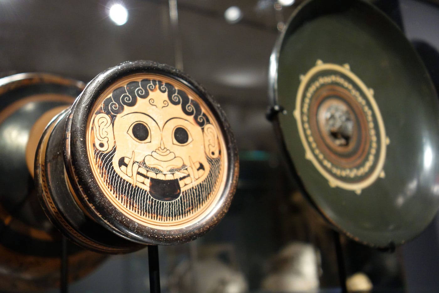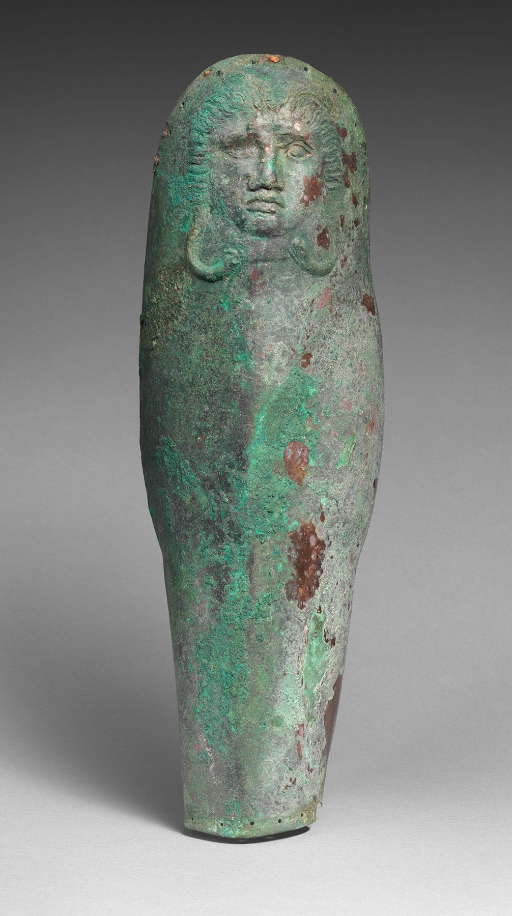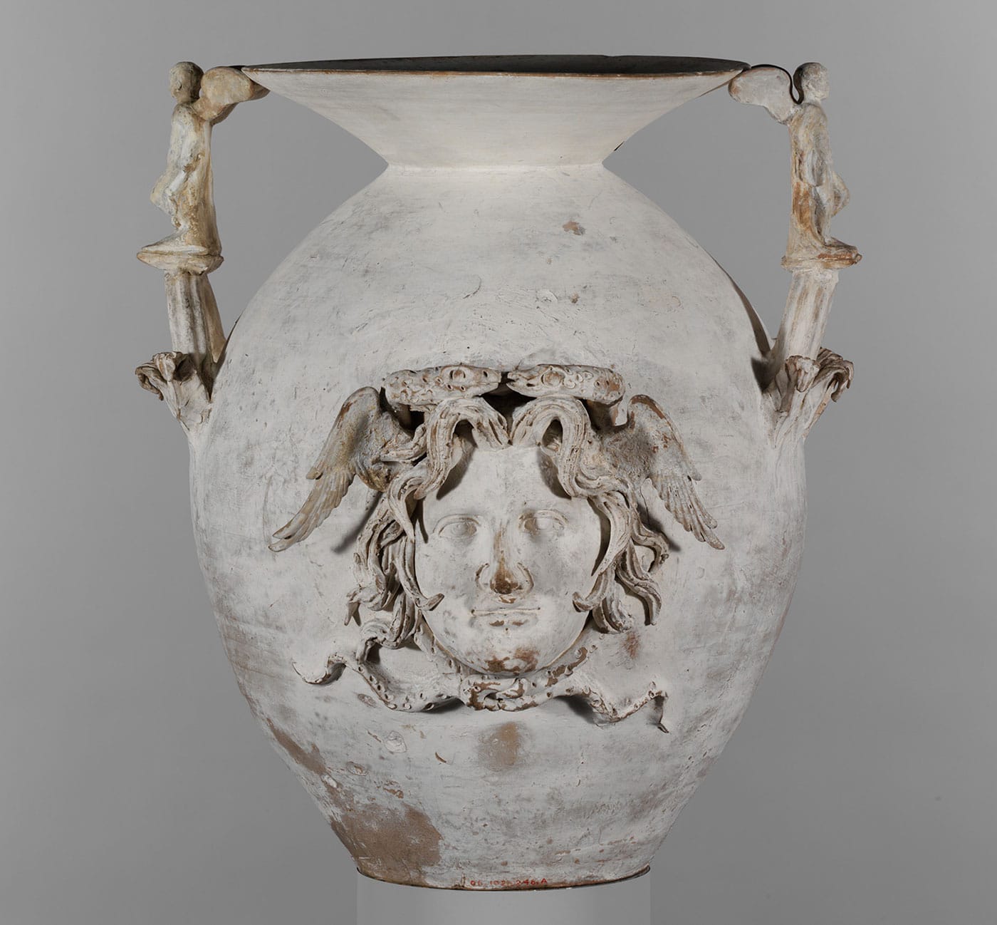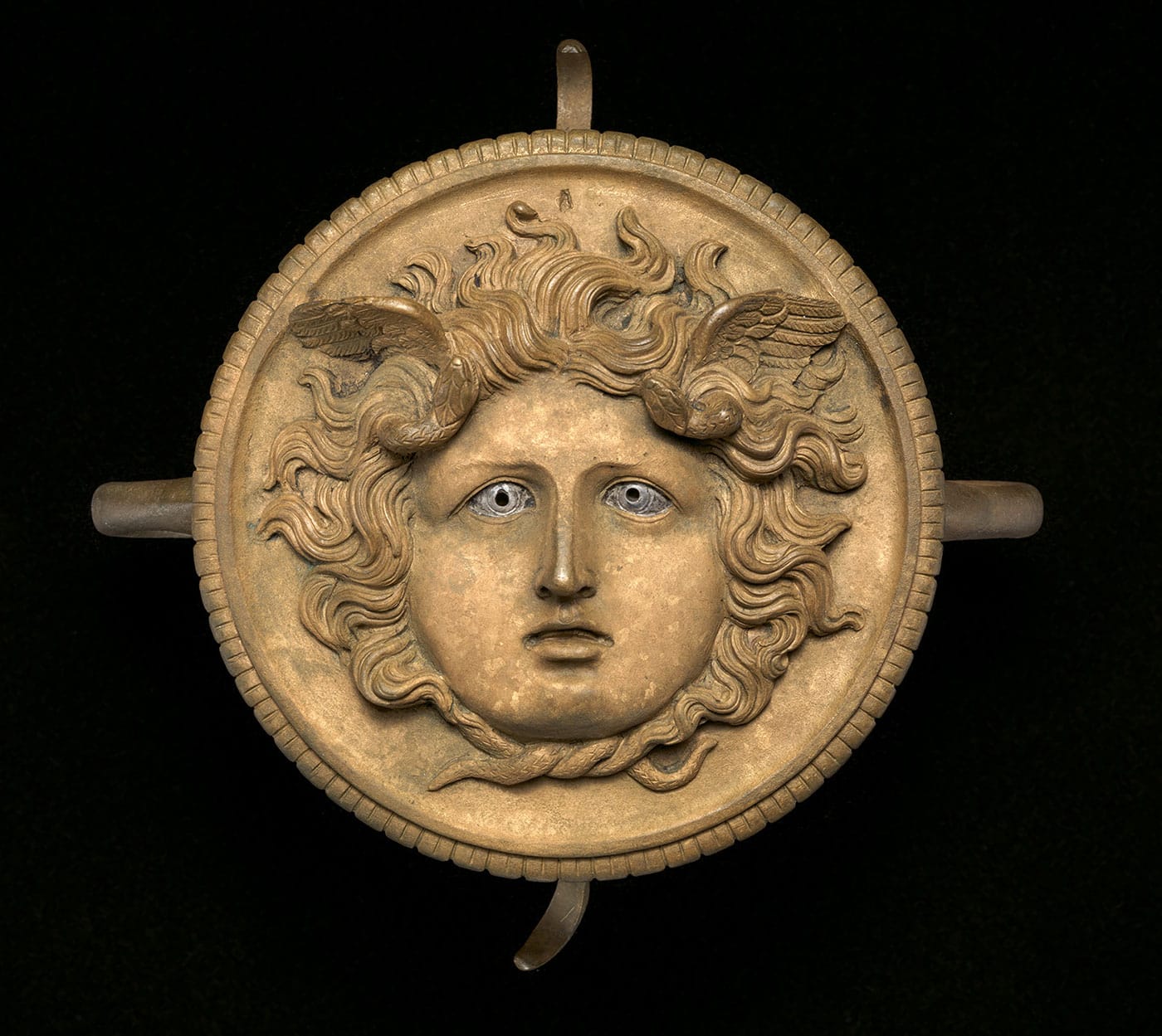Madeleine Glennon in a 2017 essay on “Medusa in Ancient Greek Art” for the Met notes that “Classical and Hellenistic images of Medusa are more human, but she retains a sense of the unknown through specific supernatural details such as wings and snakes. These later images may have lost the gaping mouth, sharp teeth, and beard, but they preserve the most striking quality of the Gorgon: the piercing and unflinching outward gaze.”