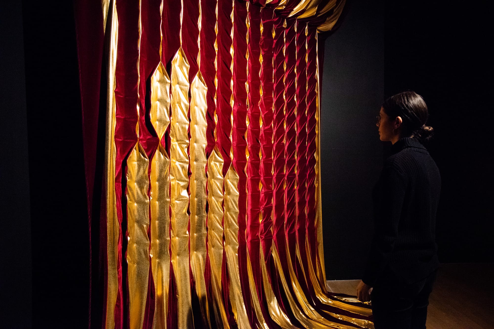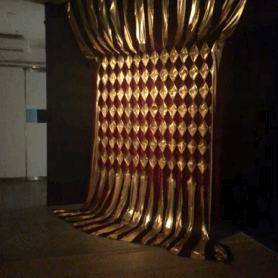 “Fabric Mirror” (2019) uses a digital camera and advanced engineering to create the viewer’s golden silhouette in fabric. It’s mesmerizing to watch the folds of red and gold fabric morph to resemble you. It’s a bit slower than the TV screen but this delay is the point. To understand climate change you have to look at long-term impacts, which immediate or knee-jerk perceptions might miss.