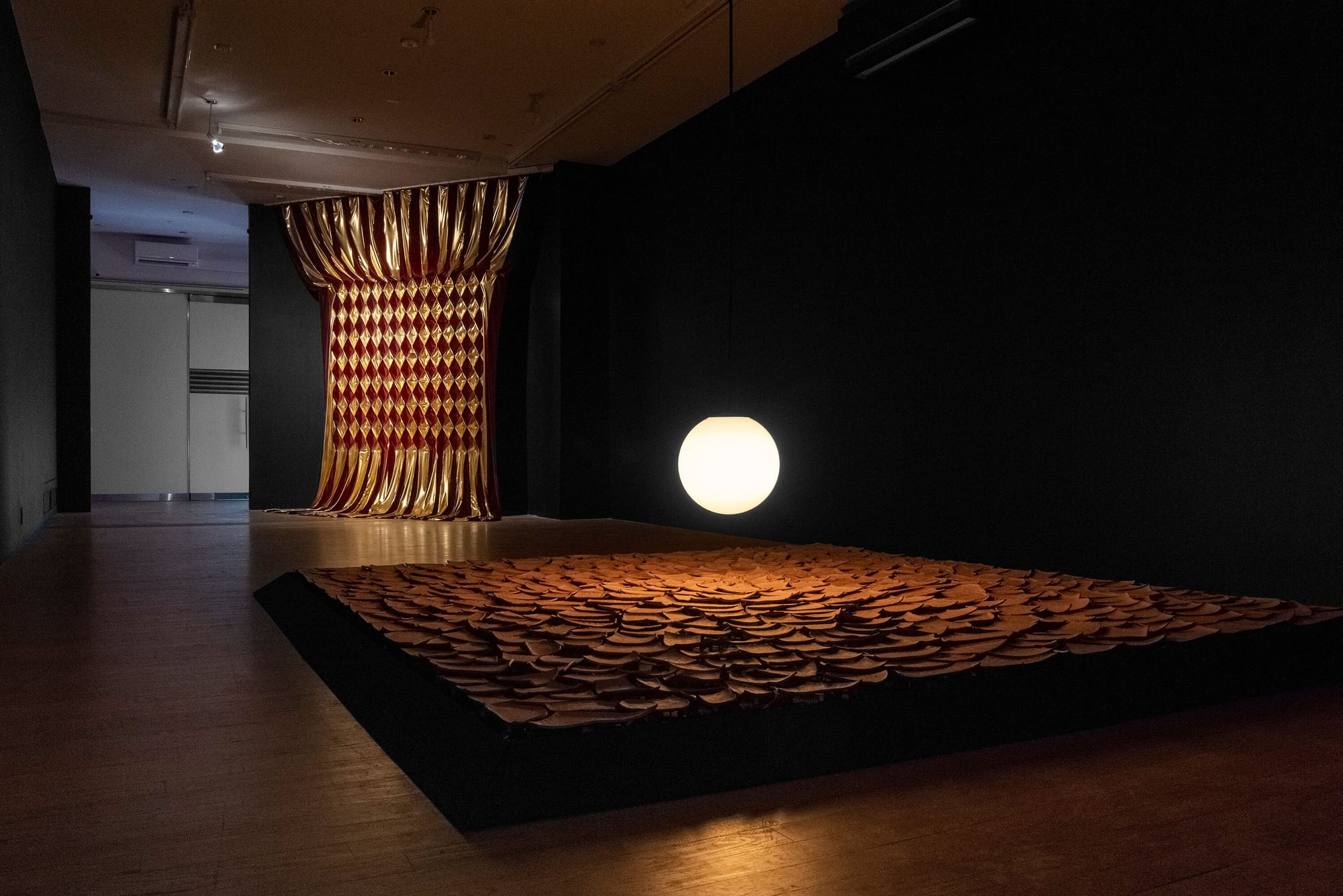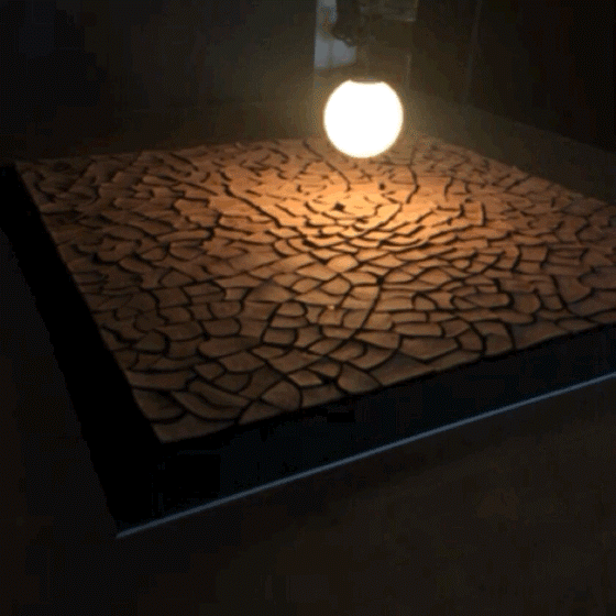 “Cracked Mud” (2019) is the centerpiece of the show. It’s a large, square section of cracked mud on the floor with a big light bulb dangling over it like the sun. The clay pieces of mud are mechanically configured to shift and swerve in response to viewers’ gestures and presences, so we get to see how we can change and shift the mud that is dried by the sun. It has a mesmerizing quality and many of us at the opening sat around it like a campfire.