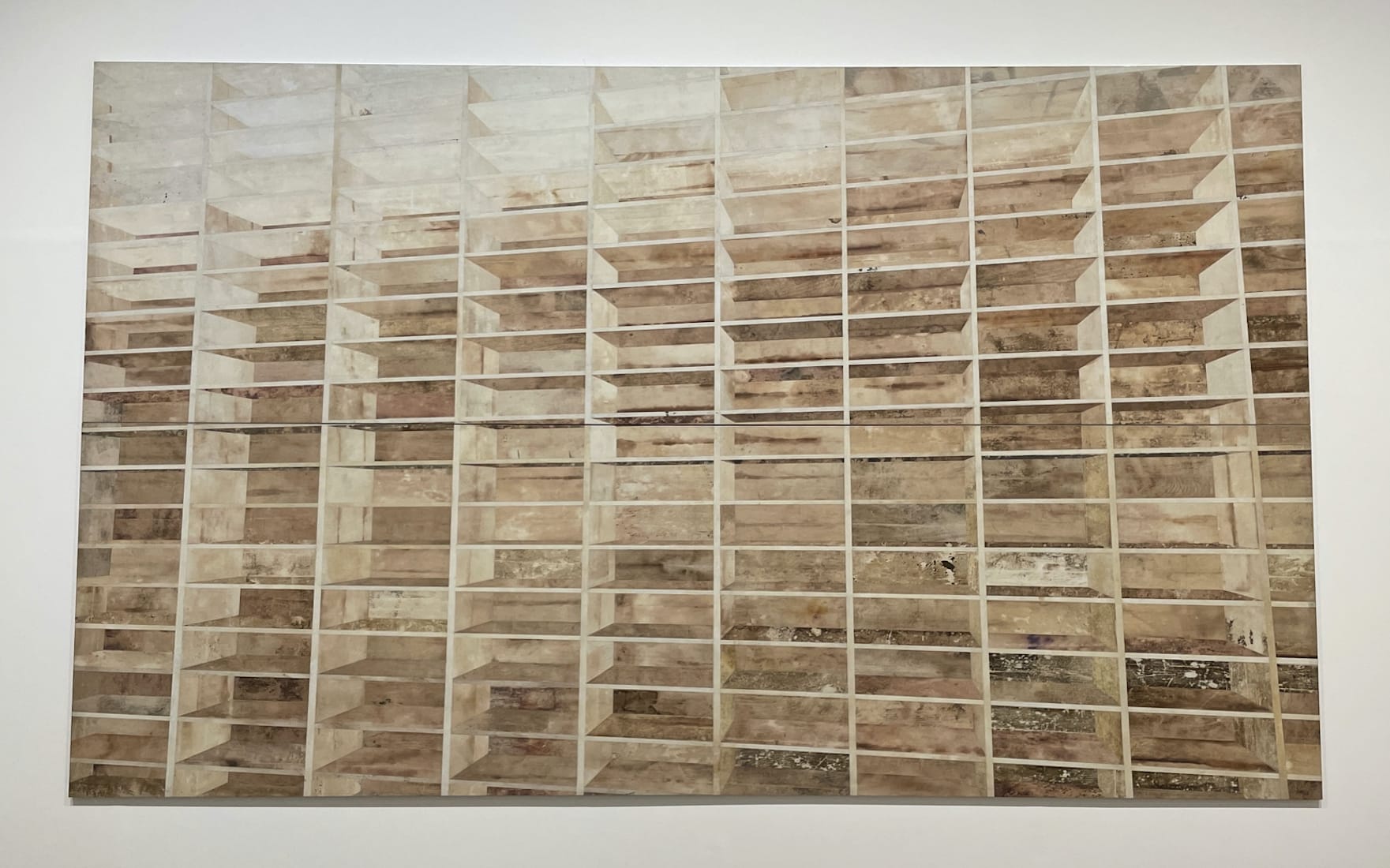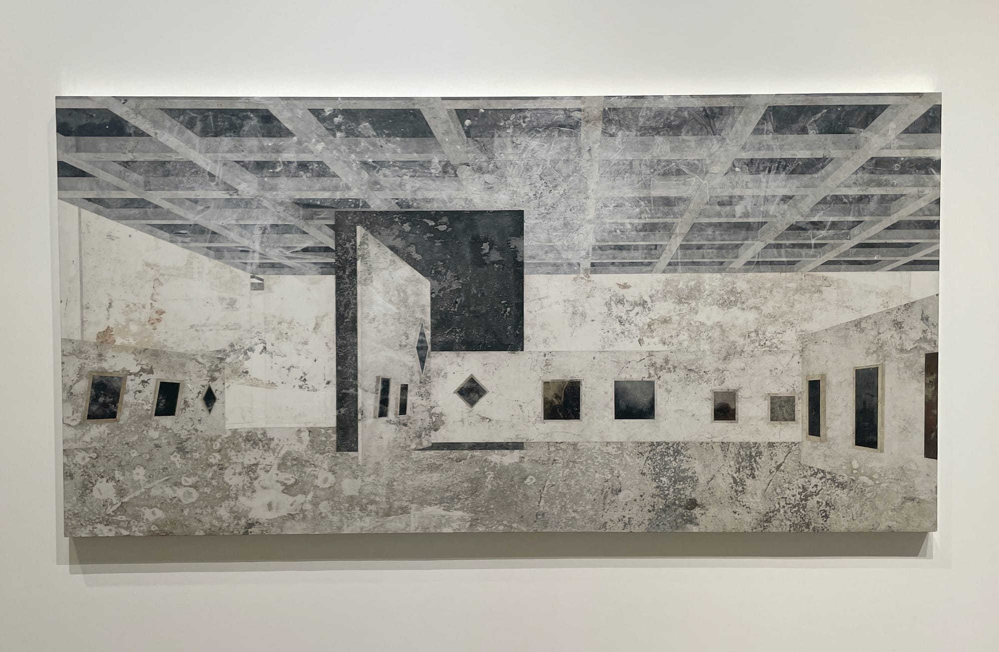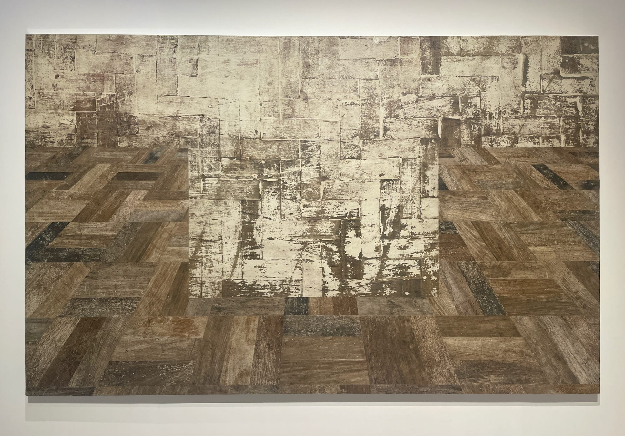 Senise’s process enhances the ties between biography and art history. In “Home” (2005), for instance, he uses glue to collect detritus from the wooden floors of his studio, and then incorporates it into acrylic paintings. The result is a sense of paint as a residue of corporeal presence and life matter. In this way, “Home,” which seems to depict an empty room with brick walls and shelving and rigging, is a much more literal transference of space and its psycho-emotional dimension to pictorial form. In an expansionist fashion, the artist also depicts art-historical buildings, including museums and other sites. “Untitled (Galeria dell’Accademia)” (2022), for example, combines wall plaster with acrylic paint, so that the residual markers are clearly visible — a commentary on the way that time imbues architecture with memory, but can also strip it away. Senise’s architecture is haunted, for even though its material basis is physically present, it presents a vision of museums as susceptible to the historical, temporal processes of erasure. The artist’s monuments are solid yet spectral masses: as witnesses to historical processes, they’re obdurately mute.