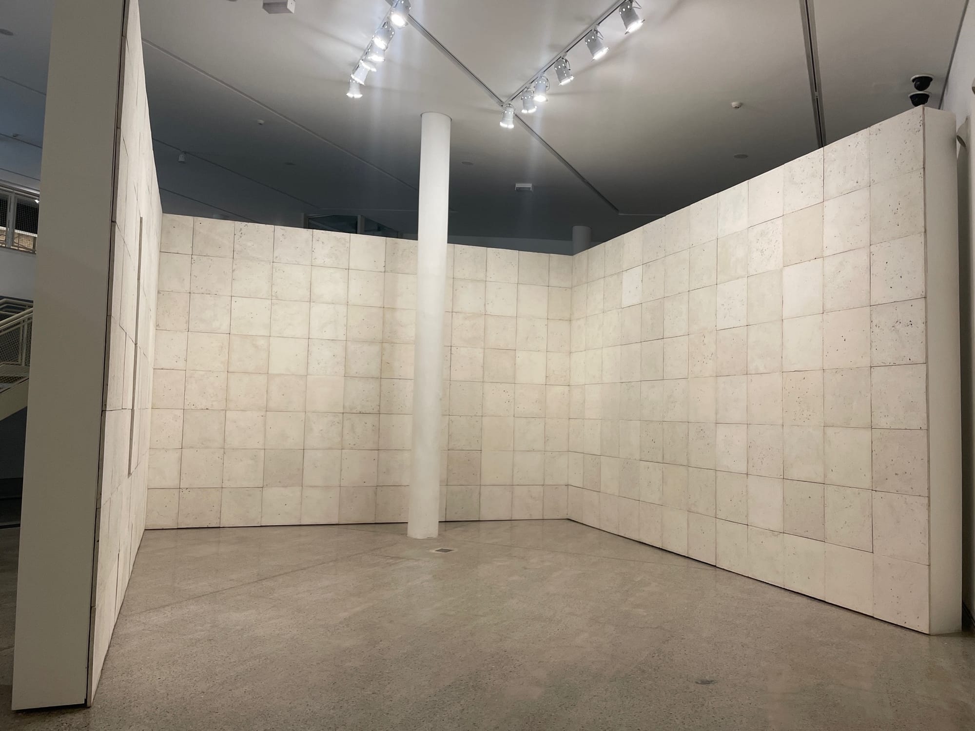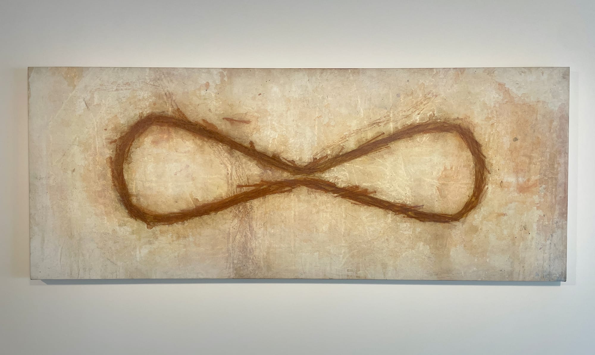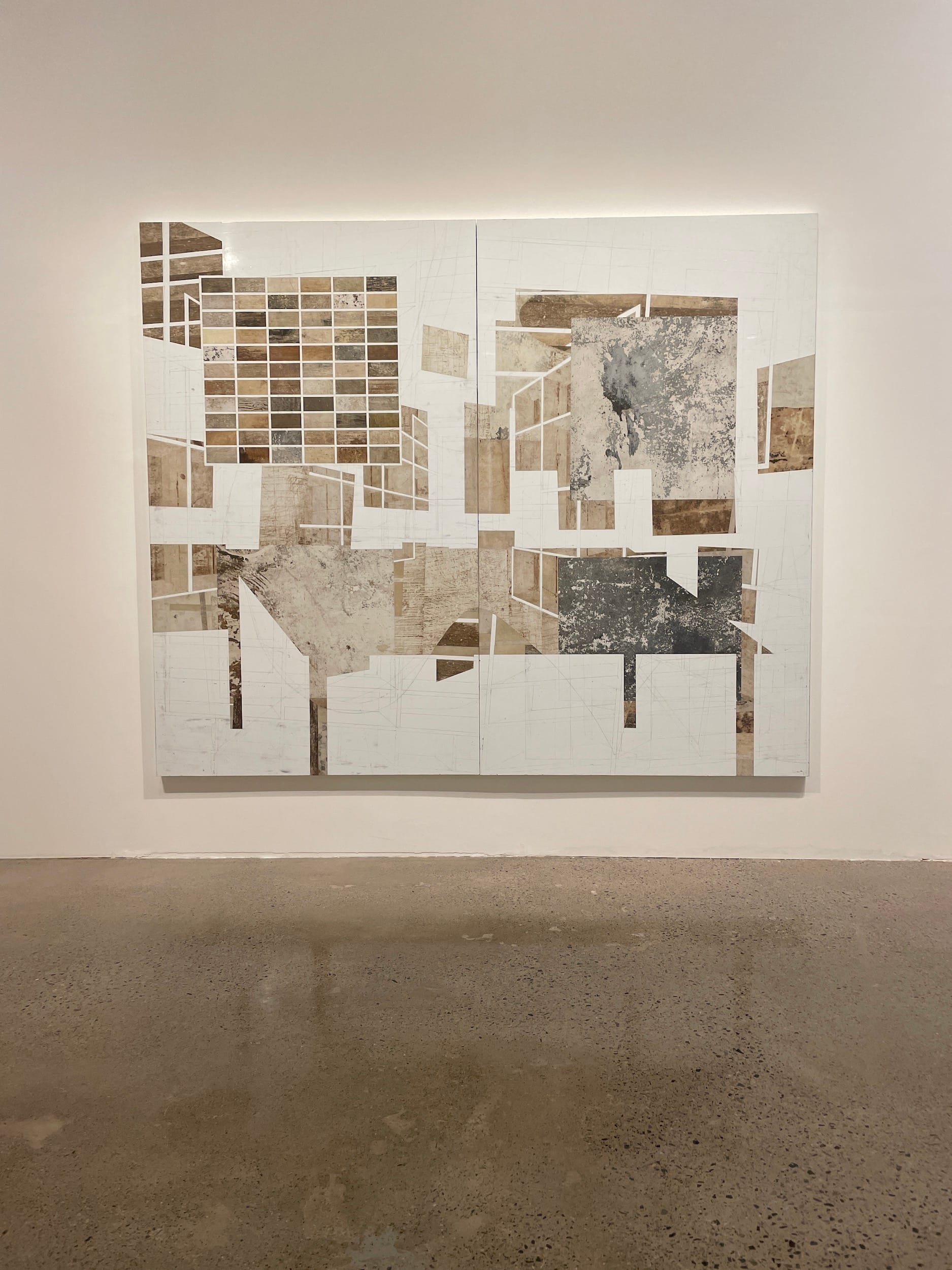 Senise’s process enhances the ties between biography and art history. In “Home” (2005), for instance, he uses glue to collect detritus from the wooden floors of his studio, and then incorporates it into acrylic paintings. The result is a sense of paint as a residue of corporeal presence and life matter. In this way, “Home,” which seems to depict an empty room with brick walls and shelving and rigging, is a much more literal transference of space and its psycho-emotional dimension to pictorial form. In an expansionist fashion, the artist also depicts art-historical buildings, including museums and other sites. “Untitled (Galeria dell’Accademia)” (2022), for example, combines wall plaster with acrylic paint, so that the residual markers are clearly visible — a commentary on the way that time imbues architecture with memory, but can also strip it away. Senise’s architecture is haunted, for even though its material basis is physically present, it presents a vision of museums as susceptible to the historical, temporal processes of erasure. The artist’s monuments are solid yet spectral masses: as witnesses to historical processes, they’re obdurately mute.