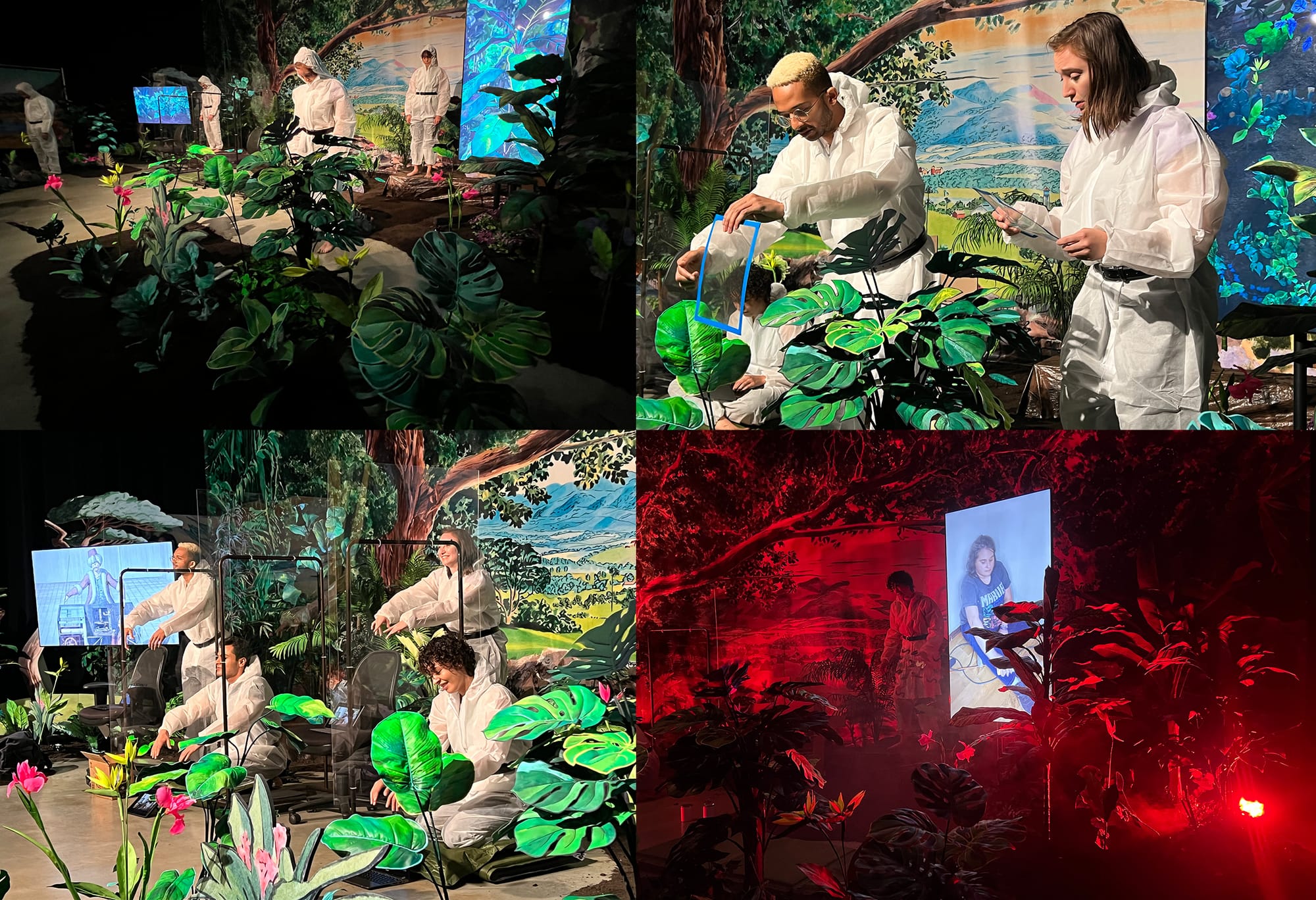 The parallels Dean makes between the two supposed utopias created by two of the richest people the world has ever known sometimes work: One chilling line spoken during the performance, “Instead of rubber, we’re extracting human emotions” captures this perfectly. But often these comparisons feel superficial: The dematerialization of the Amazon workplace versus the construction of Ford’s little model city in the Amazon never quite feels like a very convincing comparison, visually or otherwise. The performers also spend too much time fidgeting about — as when they touch the artificial plants much like keyboards between intervals of typing — and make movements that appear completely unclear and seemingly unrelated.