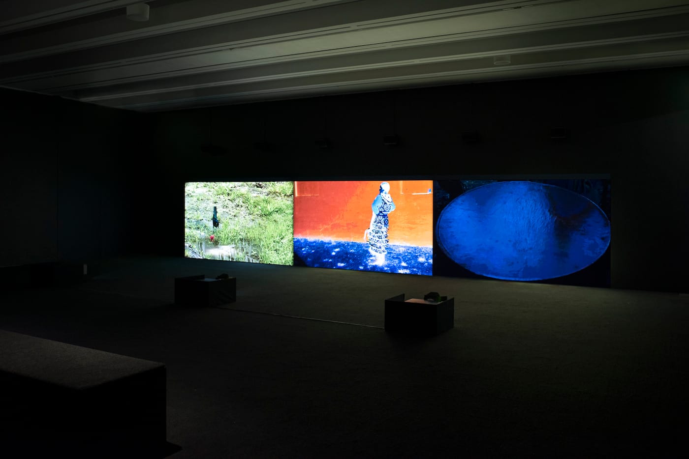 “Mother Drum” is organized into three sections, presented in a continuous loop with no discernible beginning or end. The transitions between sections are sometimes seamless, with overlapping melodies or superimposed footage projected across a long screen. Other interludes are more abrupt, with fields of color or sudden breaks in the soundtrack.