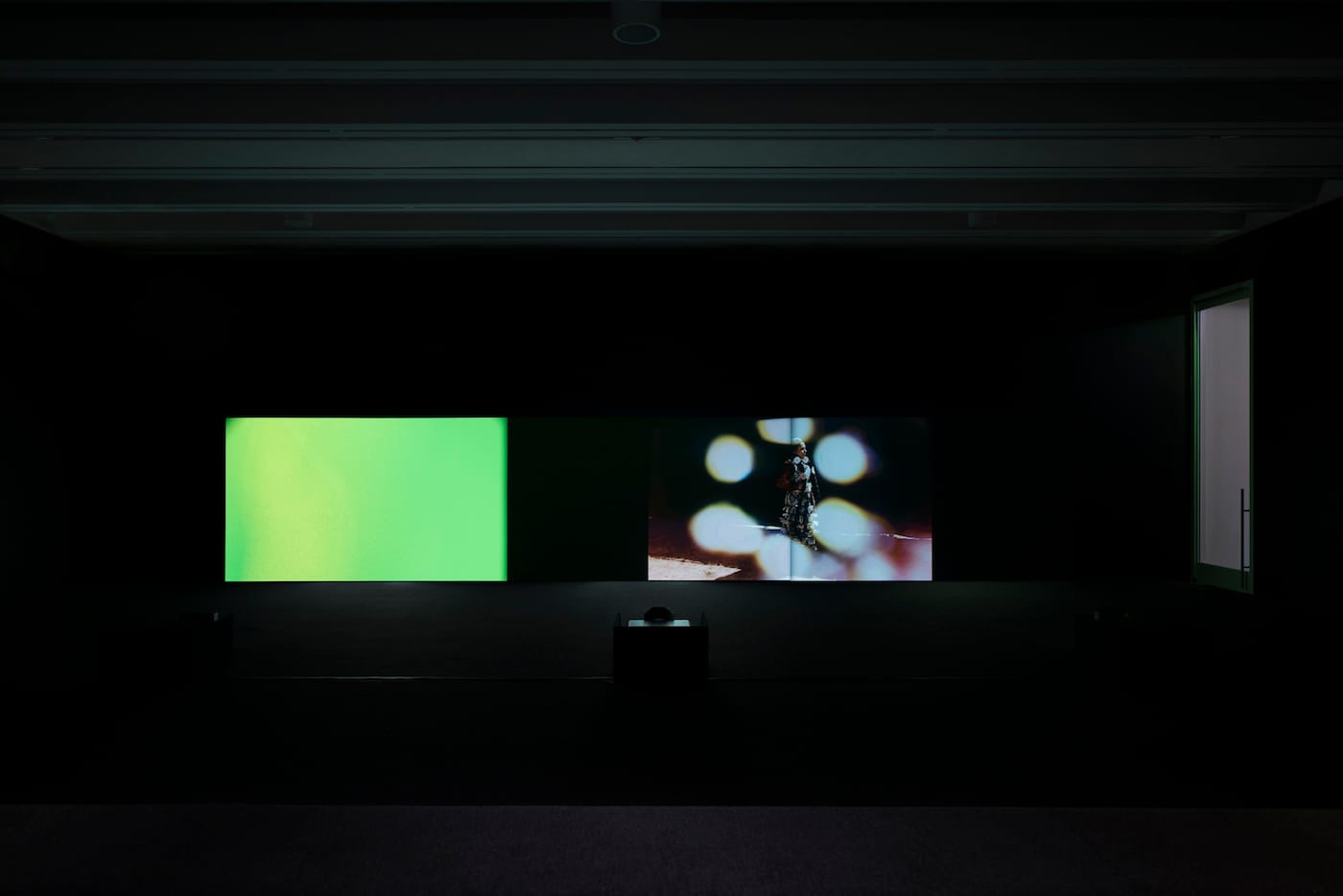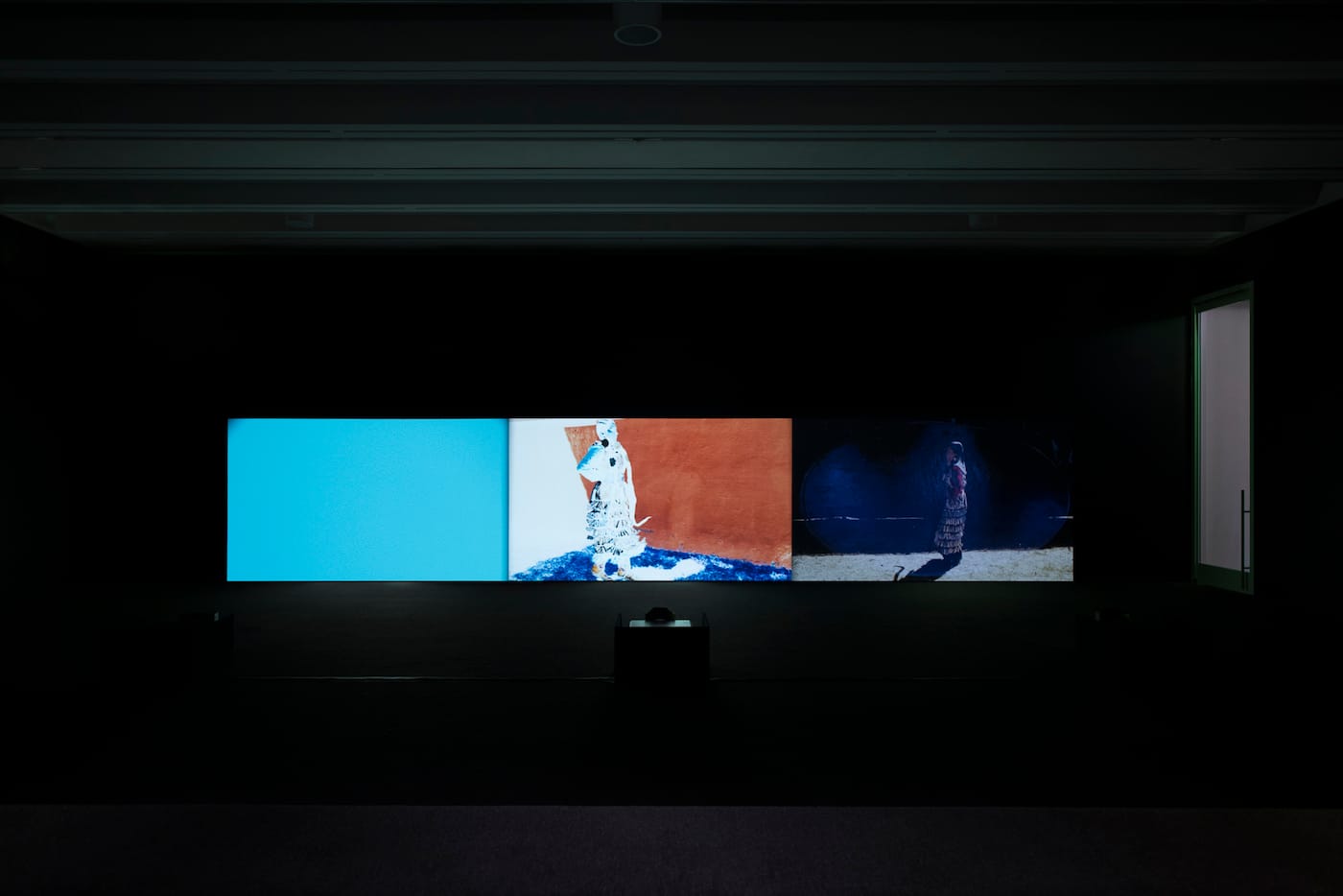 “Mother Drum” is organized into three sections, presented in a continuous loop with no discernible beginning or end. The transitions between sections are sometimes seamless, with overlapping melodies or superimposed footage projected across a long screen. Other interludes are more abrupt, with fields of color or sudden breaks in the soundtrack.