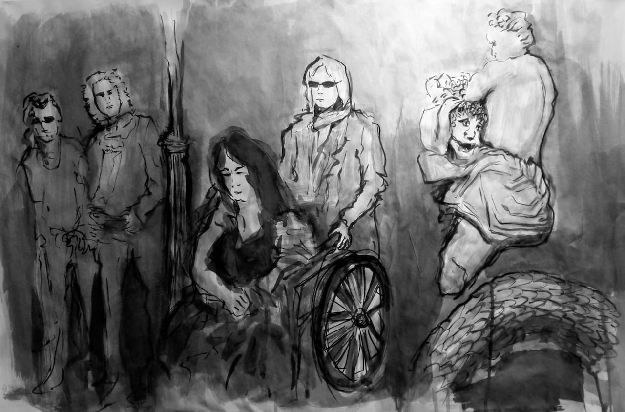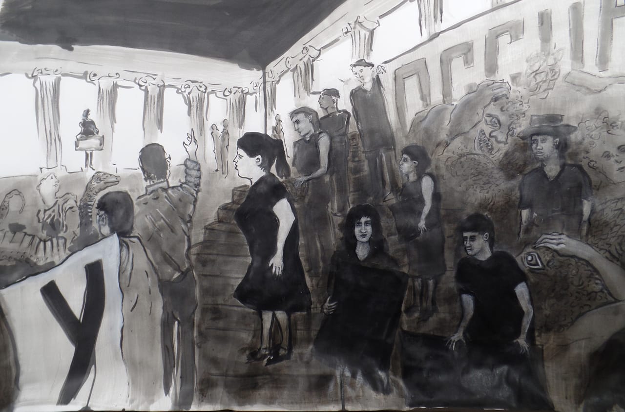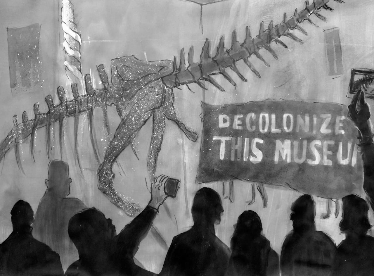 At first blush, Gregory Sholette depicts art activism in dark tones because these are dark times. He gives chiaroscuro’s gravitas to drawings of GULF, Standing Rock, and Occupy Museums protests, such as at Berlin’s Pergamon Museum, among others. But there’s more to the darkness in these scenes. Sholette is offering a new metaphor to discover: dark matter from outer space as an analogy for activism amidst the plight of our age.