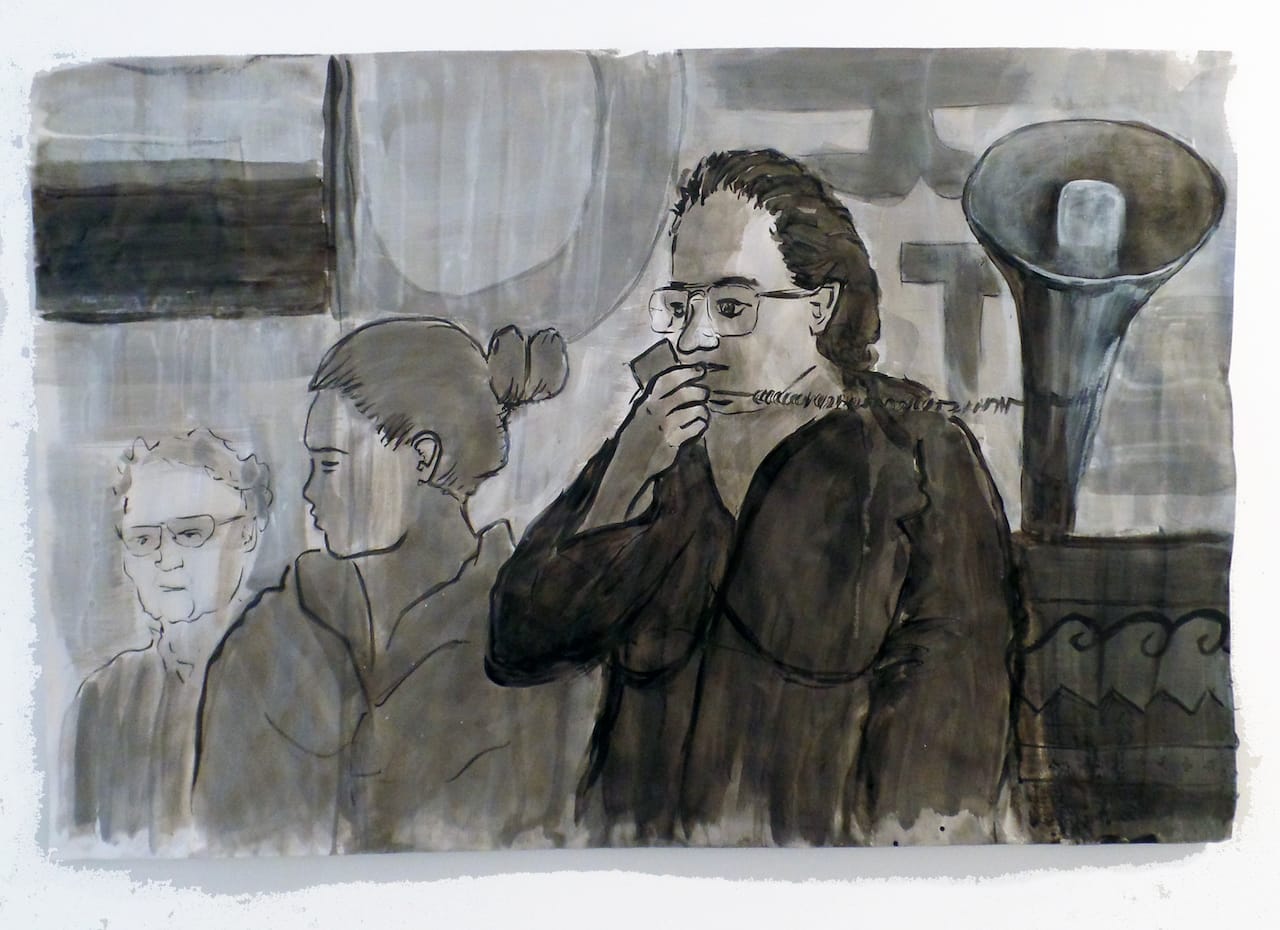 In another work, “Preparing for War” (2016), Sholette shows a scene from the May Day occupation at the Guggenheim in 2015, organized by GULF (Global Ultra Luxury Fashion). A woman entered the museum in a wheelchair, sitting on and concealing a large banner. She later stood up and unfurled the banner with other protestors in an action that took over and shut down the museum. Once again, it’s hard to pinpoint the exact effects of the action on the Guggenheim leadership or staff. Most likely, they will unfold in the dark and behind the scenes.