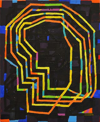 A small painting like “Untitled (P-1416)” (2014), at just 17 x 14 inches, seems almost too loaded for its size, as a continuously changing band of color twists and loops from the center toward the outer edges, and a black-violet-blue counterpoint of barely discernible shapes detonates the space beneath. It’s a high-intensity marvel of compaction, an impossible-to-comprehend maze-within-a-maze.
