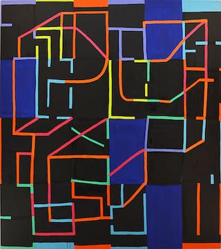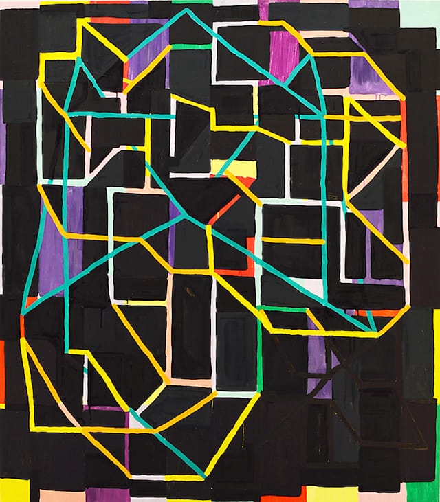 The visual riddles posed by Karolak’s paintings — their refusal to settle into a single perspective and their devilishly complex accumulation of elements — tether their freewheeling abstraction and neon color to an unknowable reality. The faceted, see-through strata of densely woven skeins of paint advance and recede in space as the clusters of line and shape swarm and disperse. Nothing is settled. The compositions seem to be the conclusion of perpetual improvisation, which comes to a rest only upon some indefinable cue from the painting itself. The flares of color intersecting the surface reflect the ubiquity and permeability of networks; they seem to chart the ebb and flow of commerce, trace traffic patterns or plot the random directionality of an electrical field.