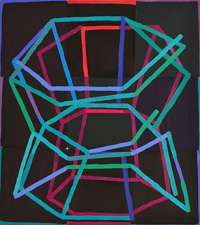 They are also an affirmation of the durability of Cubism in the 21st century — a repackaging of its spatial ambiguities into highly-keyed lines and planes that can flip their perspective at any moment, forcing your eye backwards, forwards, across and around. These works lack the deep space of the earlier larger paintings, in which the overlapping lines suggested a sculptural object hurled from an abyss. In keeping with its Cubist predilections, the space here is shallower, but its compression acts as an engine that pushes the composition forward, condensed and frontal, meeting the viewer head-on. It’s more of an all-over strategy than the previous work, but it makes for very strong stuff.