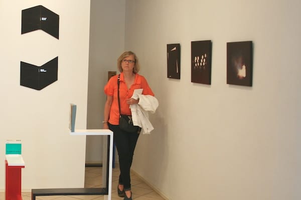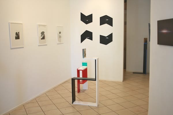 Bjoern Meyer-Ebrecht‘s sculptures are the first things to catch the eye, a trio of architectonic wooden stands sprouting in the middle of the space, de stijl compositions that float effortlessly. Each stand is topped by a single book set into a notch in the wood, standing straight up. The books are, like the rest of Dunkle Wolke, heavy reading: German critical theory, the architecture of Gropius. Mounted on the wall behind the sculptures are black architect monographs, splayed so that their bindings face outward like gutted animals. They books are cut into slices and reassembled so their covers become angular, darting silhouettes. Both books and sculptures are elegant physical and critical puzzles, referencing as they do both art and the deconstruction of art by academia.