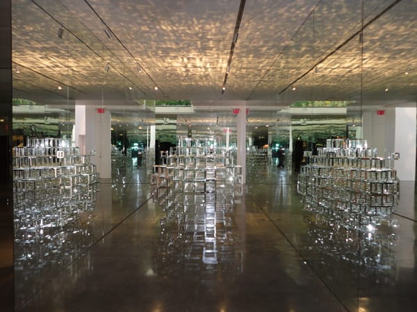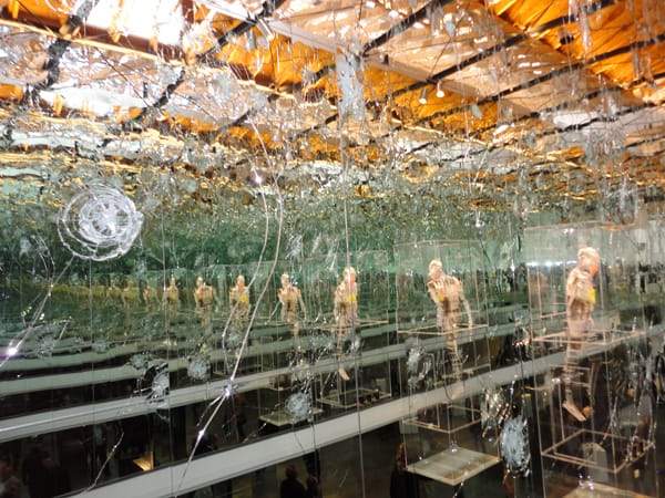 For example, in “L’Air” (2010), a nearly invisible man floats in the air with transparent limbs and perhaps a yellow heart or golden lung. The cracked mirrored walls still manage to clone him until his shape vanishes into an indistinct lemon smudge on the horizon line. It’s a fun game to strain to see how deeply you can gaze into the mirrors and how many mirror images are perceptible.