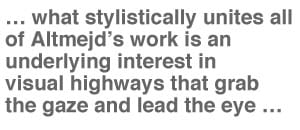 Leading the eye down the thread’s path is the residue of the artist’s process. Speaking with him before “The Swarm” at the opening, he pointed to the “heart” where it all began and then talked about how the lines sprawled out. Often, into formal suburbs he didn’t anticipate.