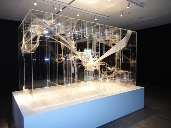 But despite his versatility and wide arsenal of motifs, what stylistically unites all of Altmejd’s work is an underlying interest in visual highways that grab the gaze and lead the eye. Whether it’s tracing over a glowing arabesque diagram on the ceiling, following a yellow heart’s reflection towards its vanishing point, getting lost in the maze of intersecting fingerprints on a bodybuilder’s body, or following the circuitous routes of colorful threads inside a glass box, this sculptor satiates the eye’s hunger to cruise down its own optical Route 66s into the California sunset. Thankfully, he leaves out the smog.