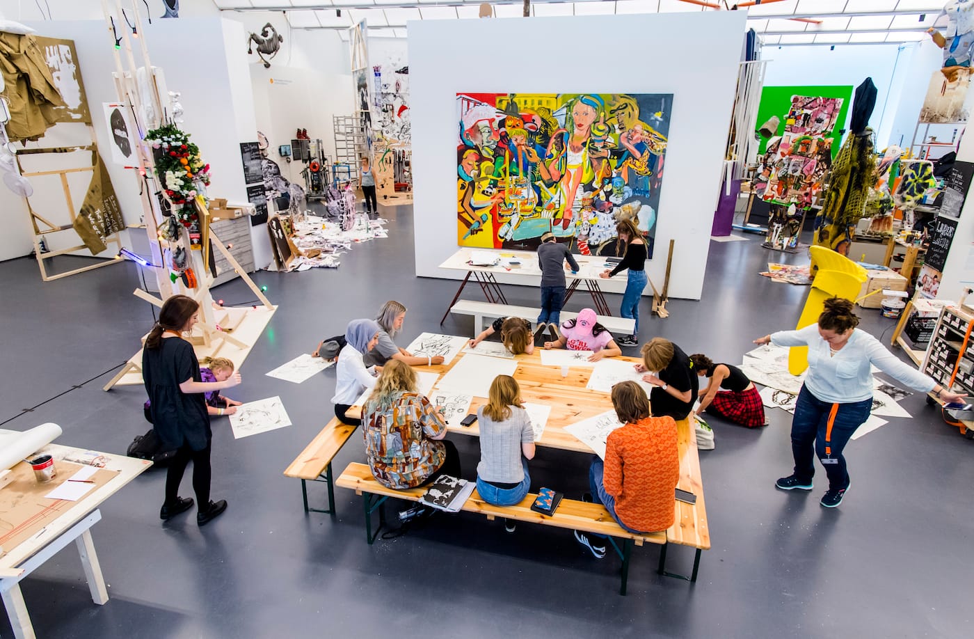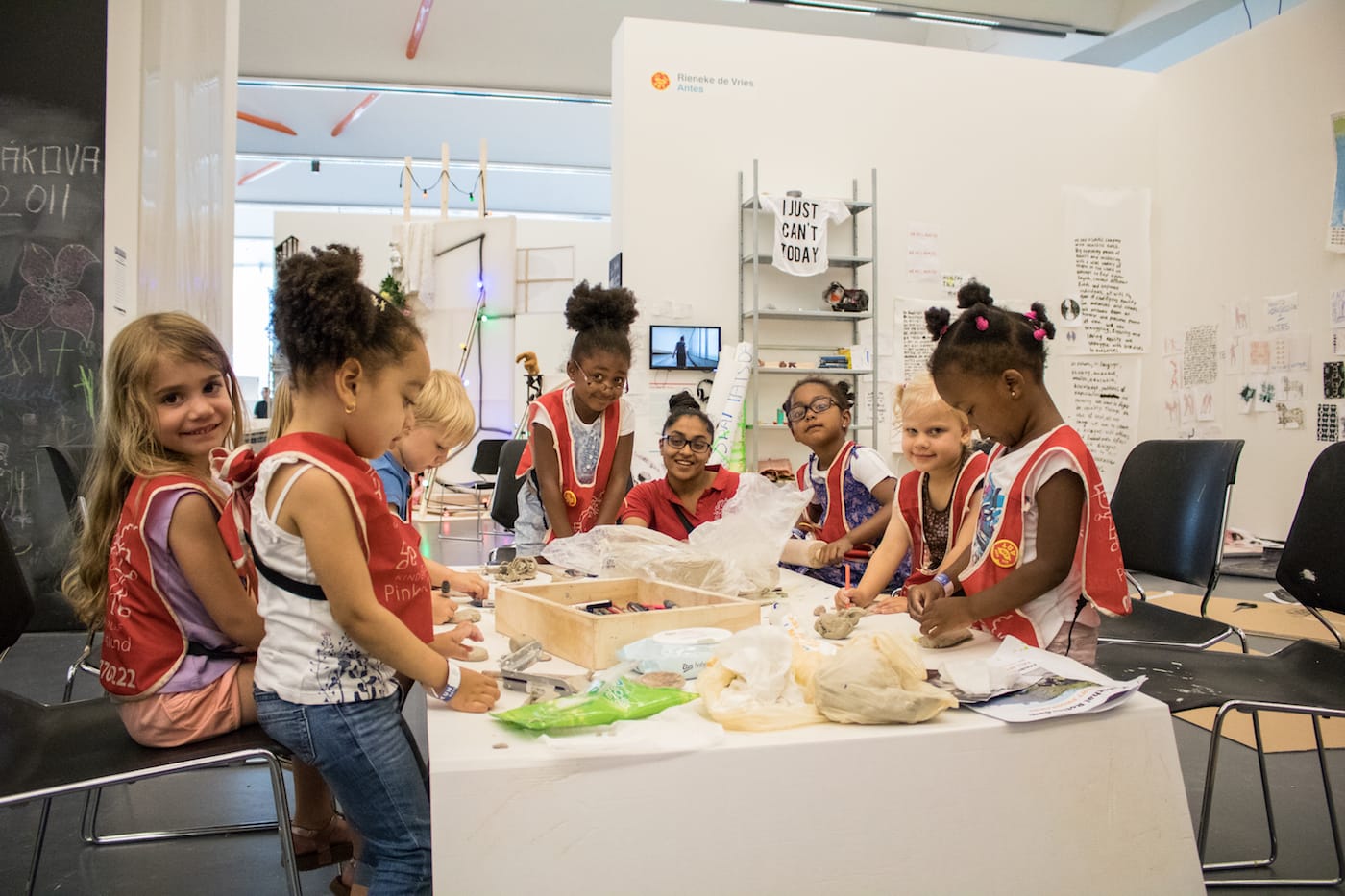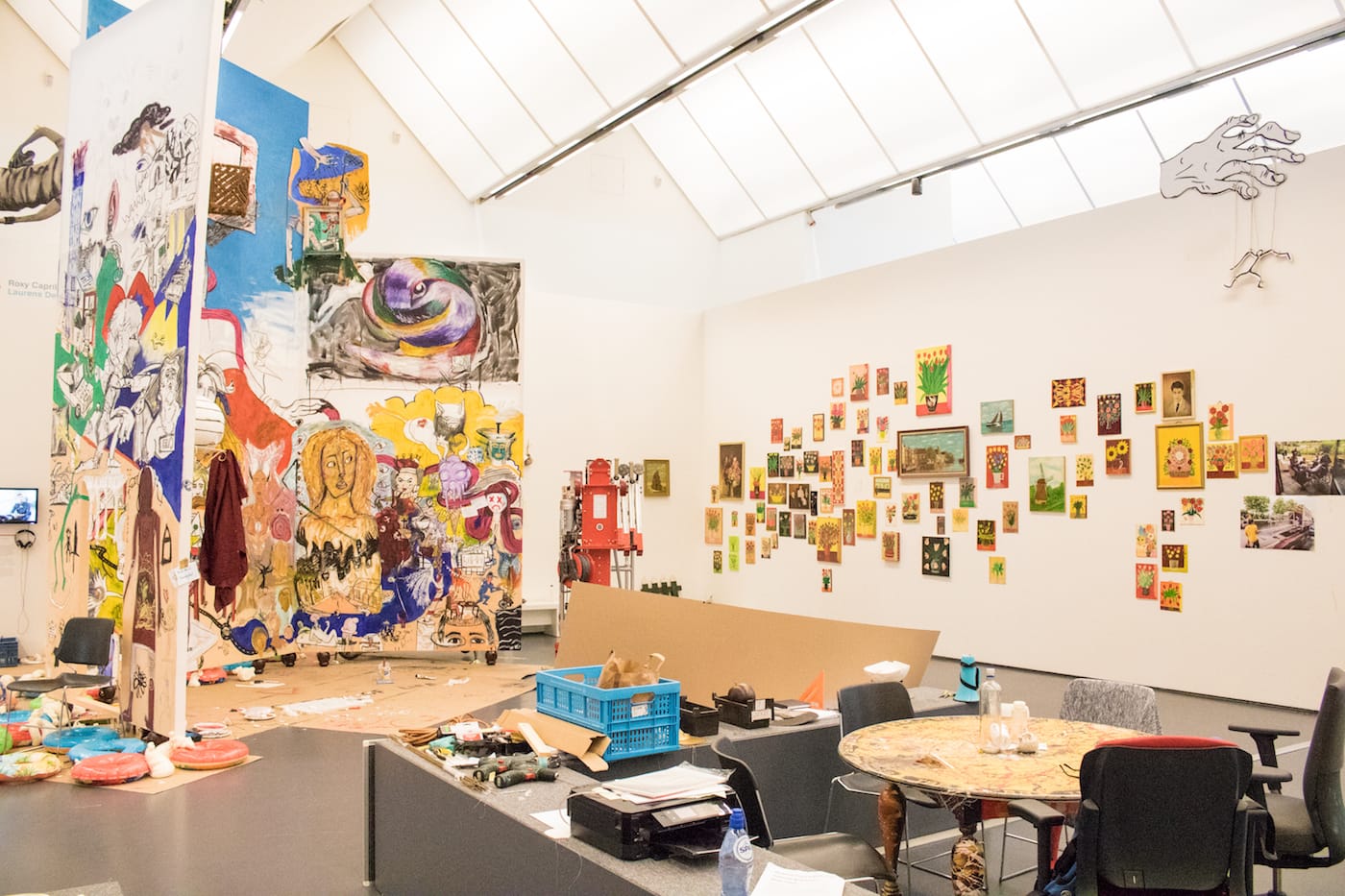 For the second of three consecutive summers, Bade and Martha installed an outpost of IBB at the Kunsthal Rotterdam under the name All You Can Art 2. The popular show, which makes great use of the Kunsthal’s high-ceilinged and glass-walled exhibition space and loft-like floorplan, imports IBB’s participatory spirit and progressive educational structure into a gallery setting. An exhibition and open studio, it includes historical overviews of IBB, exhibition spaces, stations for visitors to make their own art, workspaces for IBB students, and the unenclosed studios of Bade, Martha, and former IBB artists-in-residence Liesbeth Labeur, Roxette Capriles, Elvis Chen, and Rieneke de Vries (in which visitors are invited to participate). Packed wall-to-wall with art and art supplies, All You Can Art 2 evokes the carnivalesque atmosphere of an elementary school art fair — only here you don’t have be the proud parent of a child in the show to find the work compelling.