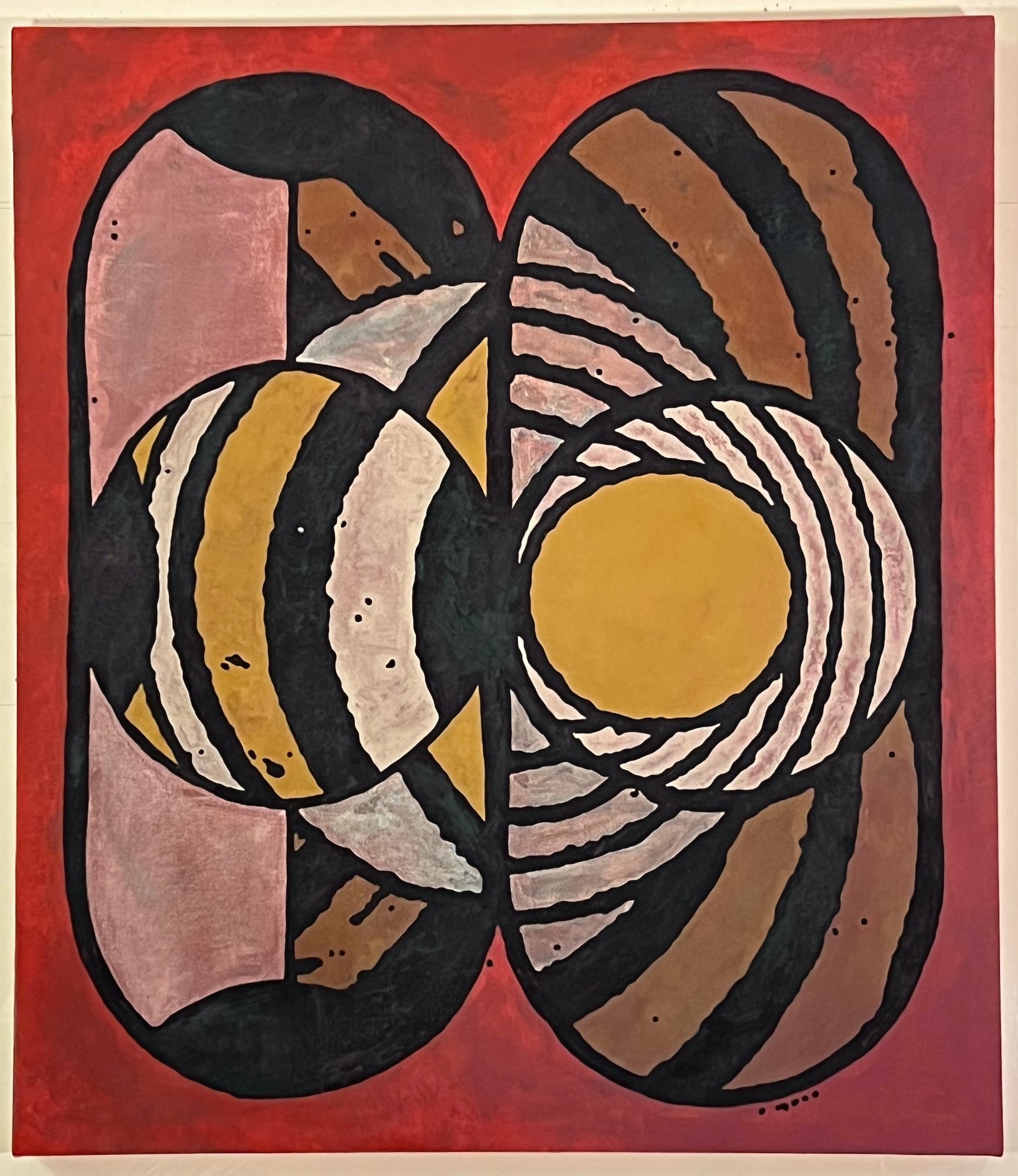 “The Ninth of Ninth” (2024) focuses on the conjoining and separation of forms. Two vertical oblong forms abut each other, creating a taut sense of visual tension between symmetry and asymmetry. The shapes are both permanently joined and forever distinct. A circle at the center of each form contains further circular lines, while a larger circle behind these divides the wholes into multiple parts.