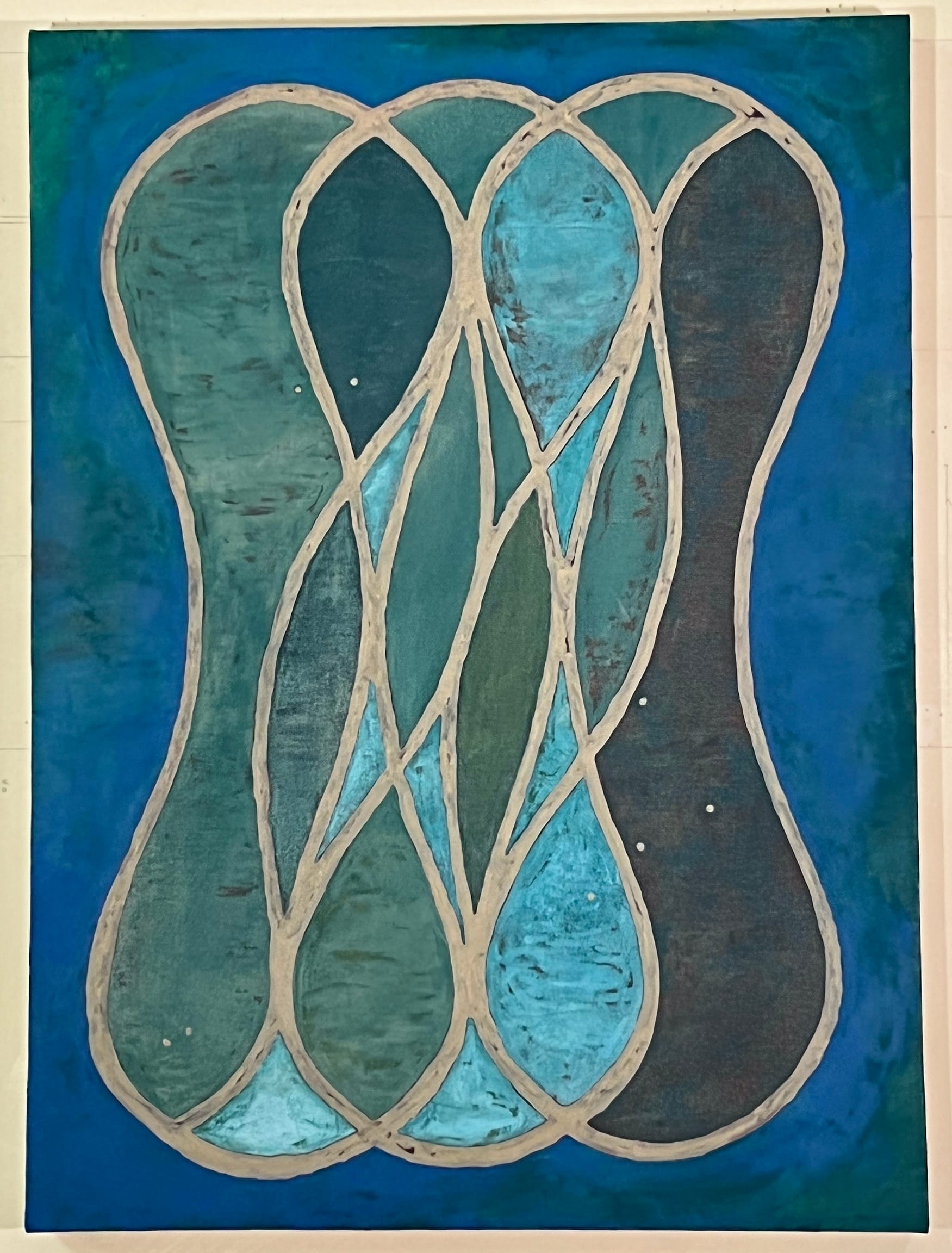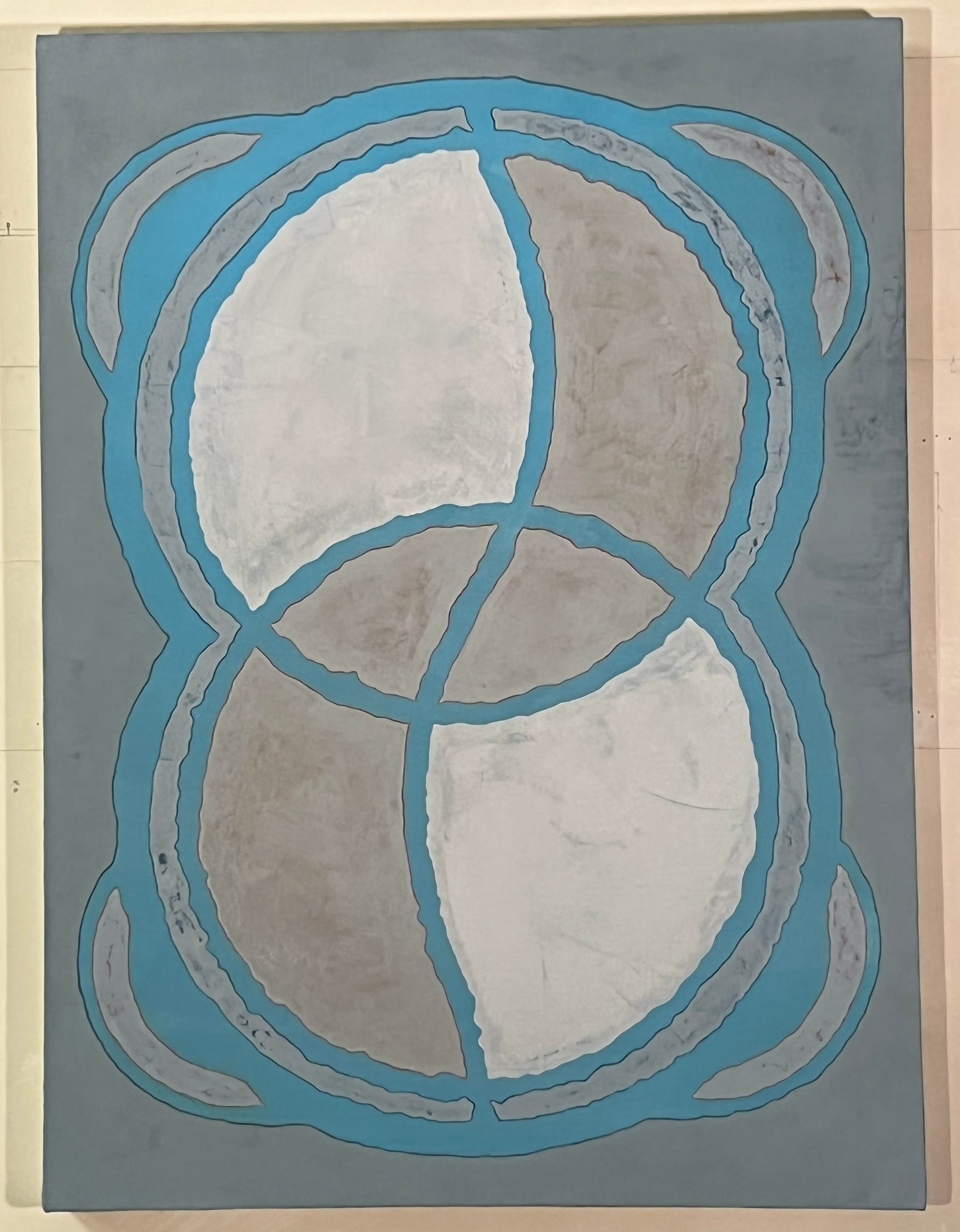 In “She Knew No Other Way” (2023), Baker renders three overlapping pinched forms, outlining them in thick gray paint. Muted blues and blue-greens fill many of the shapes created by the forms’ overlapping outlines, while a different blue mixed with gray in one large interior section offsets the sense of visual symmetry. For “Undulate (Vesica Piscis)” (2021), a ragged cerulean blue line composes a figure eight containing overlapping concentric circles. The resulting interior shape in each circle is known as vesica piscis (“bladder of a fish”). Four semicircles rising from the outer edges of the overall form invite us to read them as ears, while an undulating cerulean blue line snakes down the form’s center vertically. The entire image is set against a cool gray ground. While the configuration is derived from a xerox, everything feels hand painted, with particular attention paid to tone.