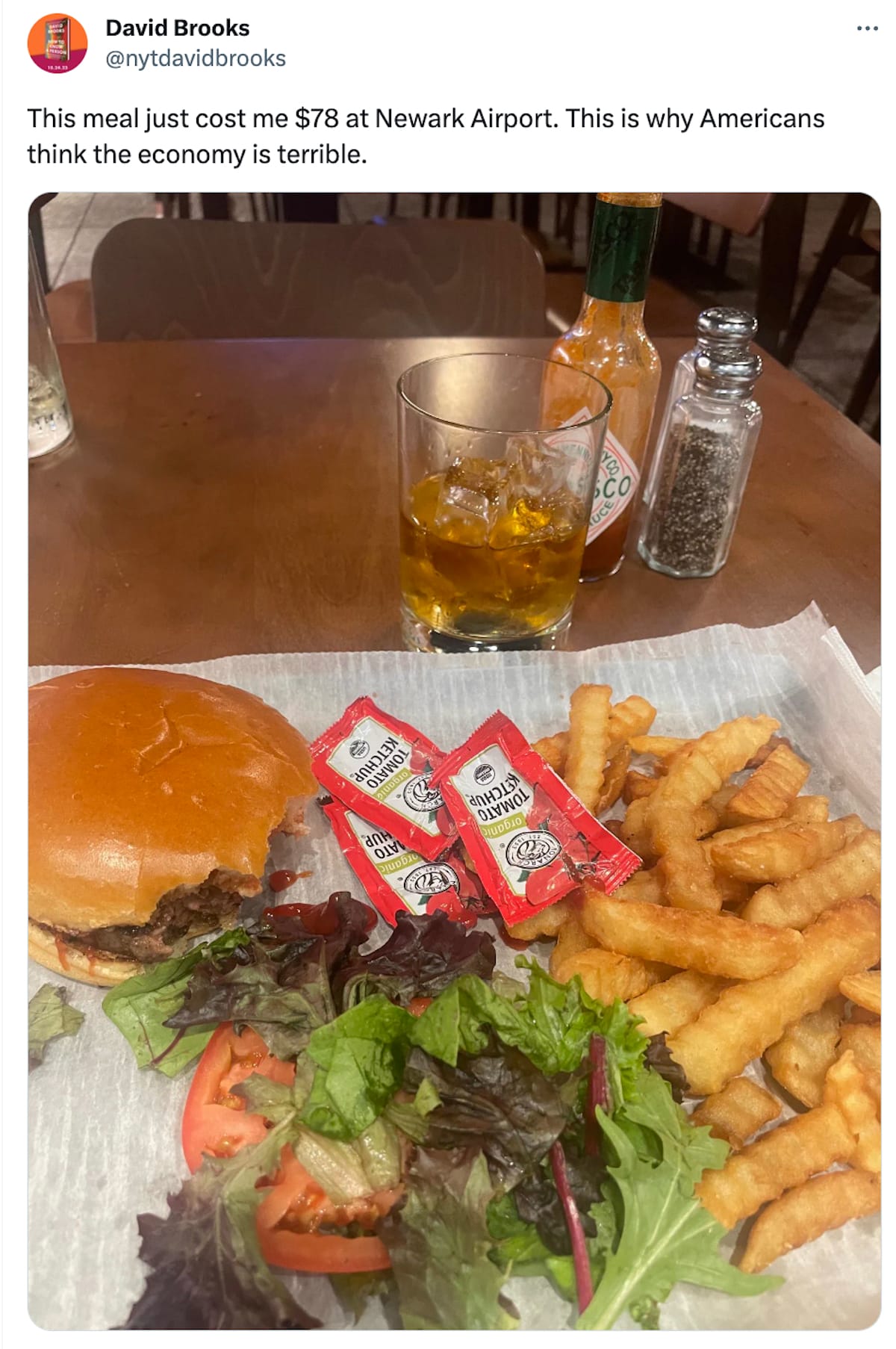 We're all familiar with how expensive a sit-down meal at any airport can be, but who could possibly wrap their heads around spending $78 for a burger and fries? Well, New York Times columnist and moderate sociopolitical commentator David Brooks would have liked for us to believe that this was his experience when dining at the 1911 Smokehouse Barbecue in Newark International Airport as he lamented the state of America's economy in a post on X (formerly Twitter) on Wednesday, but the restaurant chucked him on the grill with a searing fact-check about the alcoholic drinks he conveniently failed to account for.